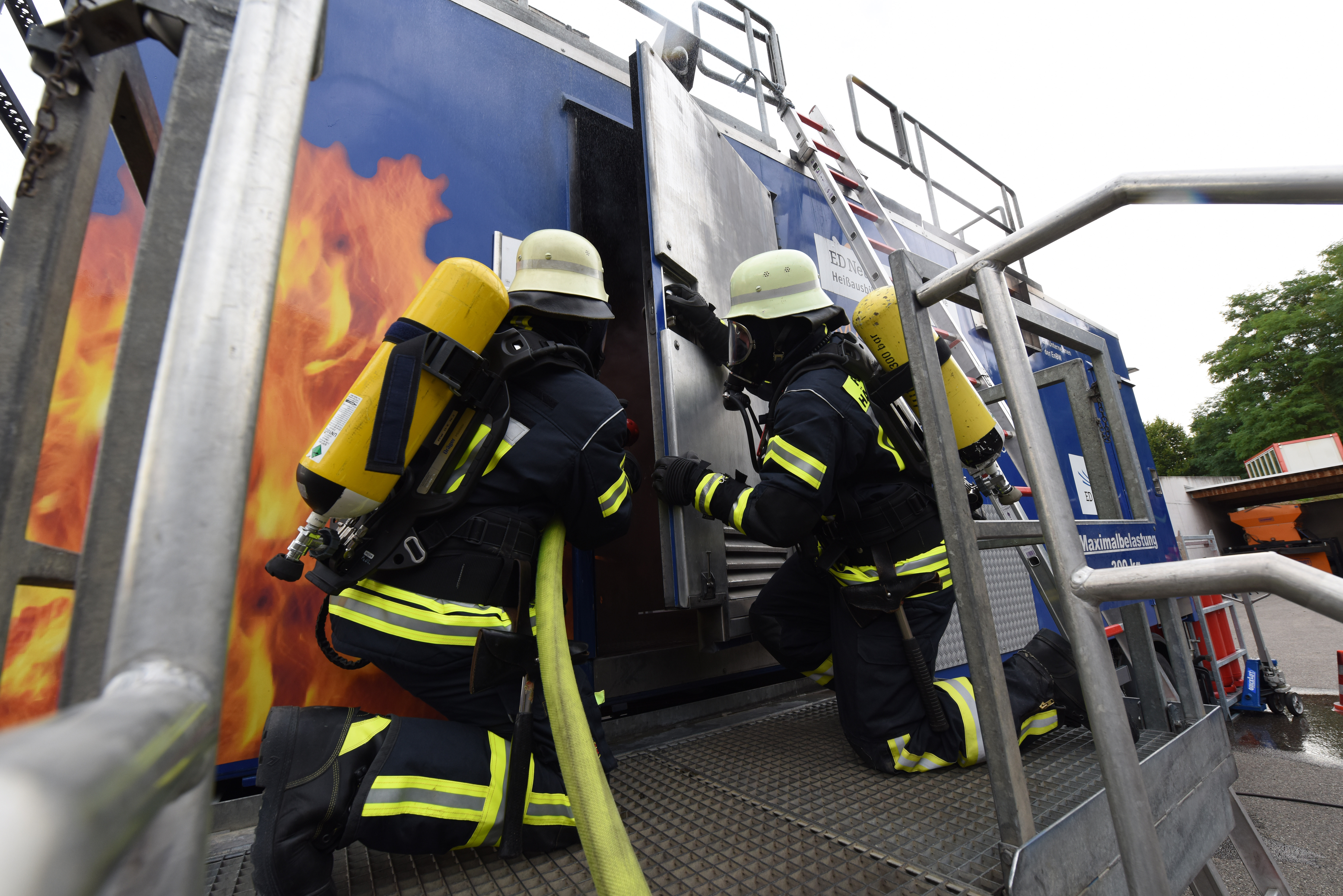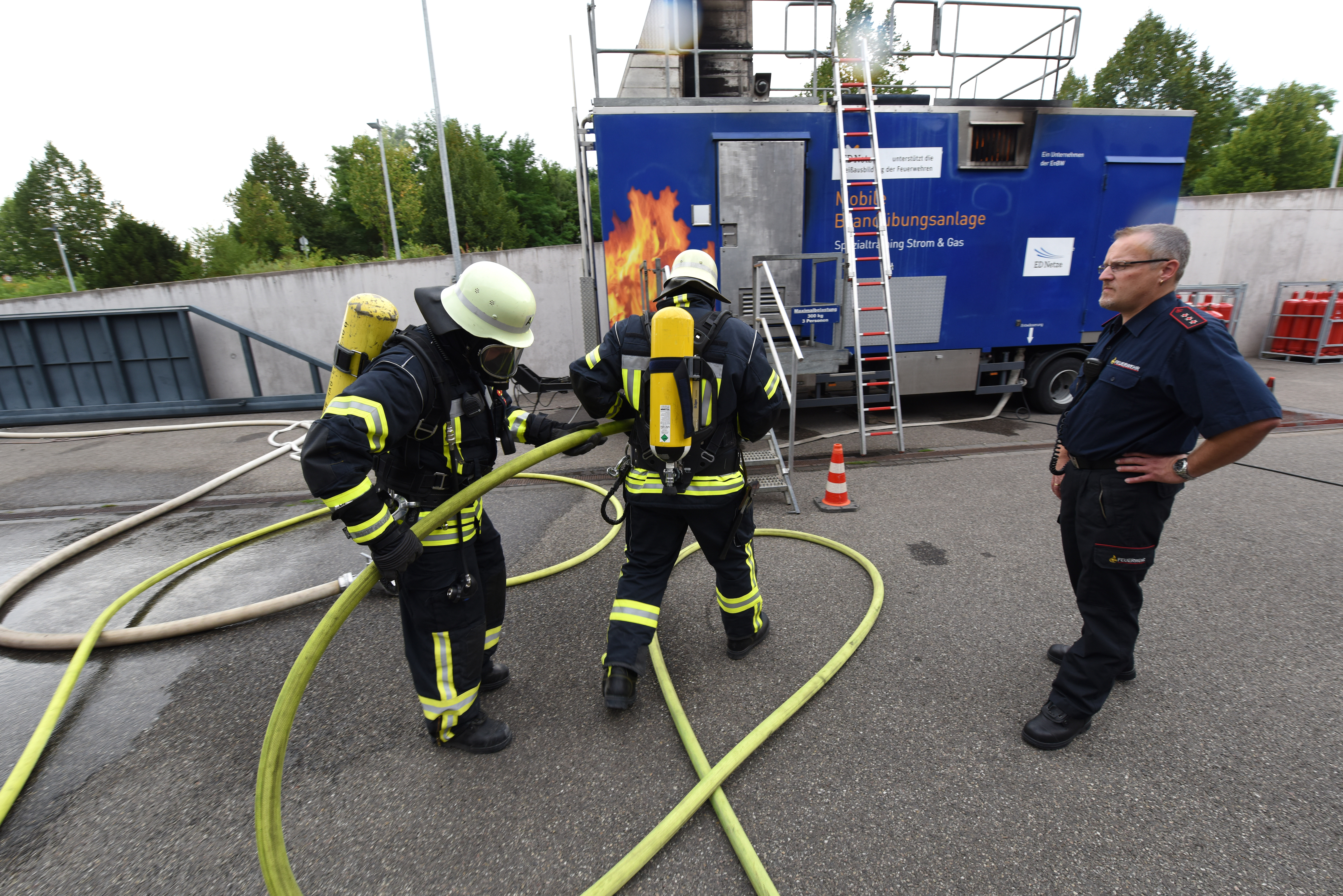 Mit diesem Angebot unterstützt ED Netze die Feuerwehren im Rahmen der Atemschutzausbildung vor Ort. „Wir möchten mit der mobilen Brandübungsanlage für Gefahren sensibilisieren, die an Einsatzstellen durch Strom und auch Gas entstehen können“, betont Markus Linder. Regelmäßig unterweist ED Netze Feuerwehren, um sie auf das Gefahrenpotenzial und das Löschen von Bränden an unter Spannung stehenden Anlagen vorzubereiten und führt Übungen in Umspannwerken durch. In diesem Jahr haben sich etwa 160 Feuerwehrleute zu den Übungseinheiten angemeldet.