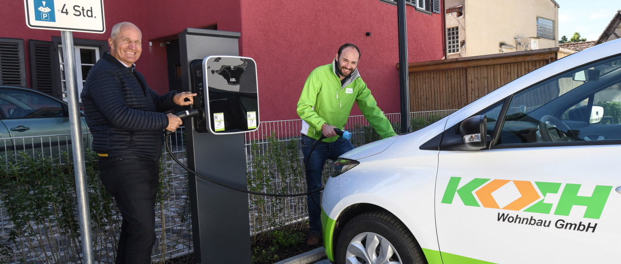 Foto: Hans-Christian Grützner (l.), Geschäftsführer der Koch Wohnbau GmbH, und Nils Hoesch (Energiedienst) nehmen das Elektrofahrzeug und die Wallbox im Wohnquartier Winzergarten in Kirchhofen in Betrieb. Bild: Energiedienst/Juri Junkov