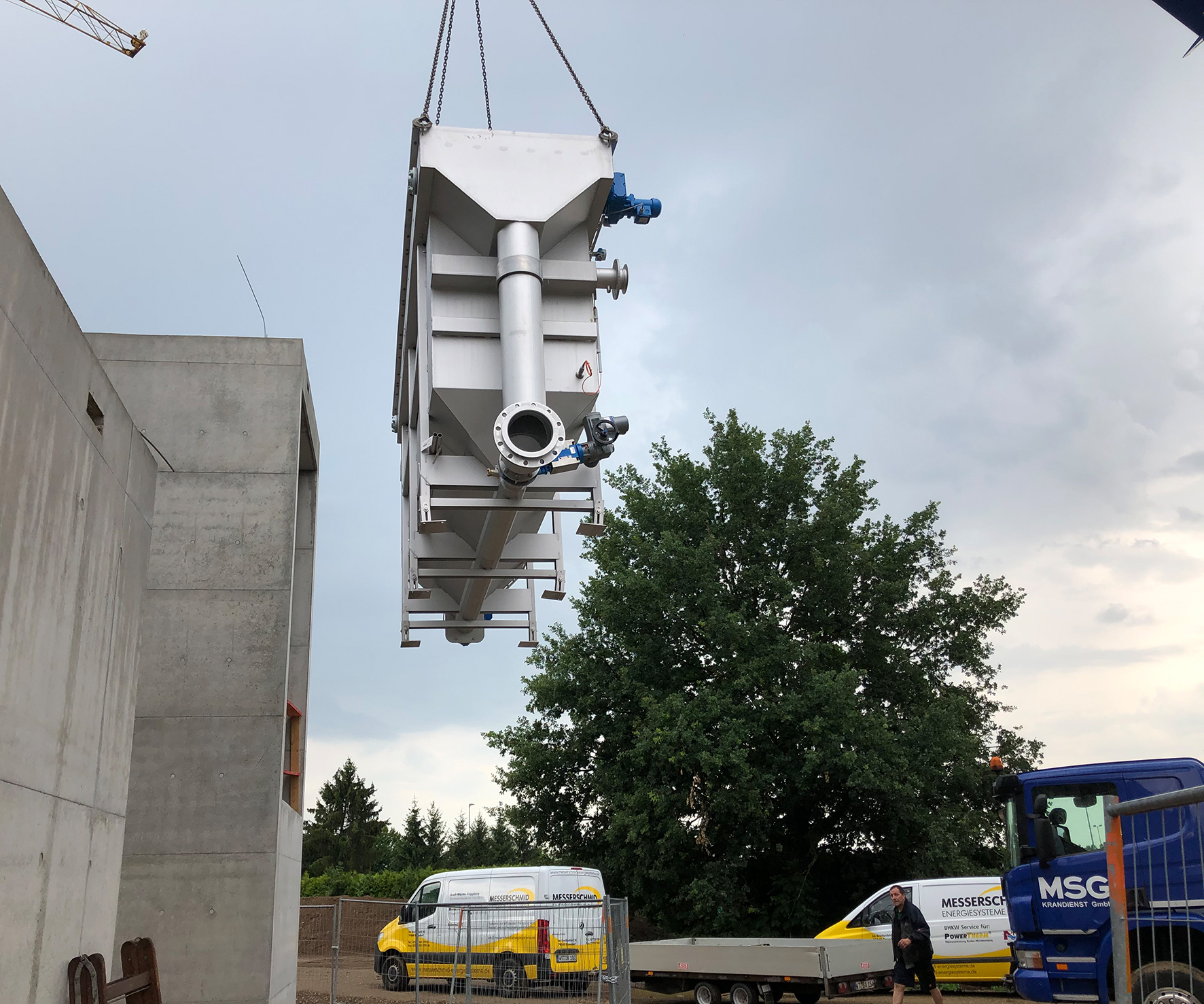 Die beiden 4,5 Meter mal 1,2 Meter und 2,4 Meter hohen Bauteile kamen pünktlich auf der Baustelle des neuen Rathauses in Schallstadt an. Mit dem Autokran wurden sie vom LKW gehoben und schließlich von der Firma Messerschmid Energiesysteme in das Techniknebengebäude des Rathauses eingebracht. Zukünftig werden neben dem Rathaus auch 200 Wohneinheiten mittels „kalter Nahwärme“ mit Wärme und Kälte versorgt.