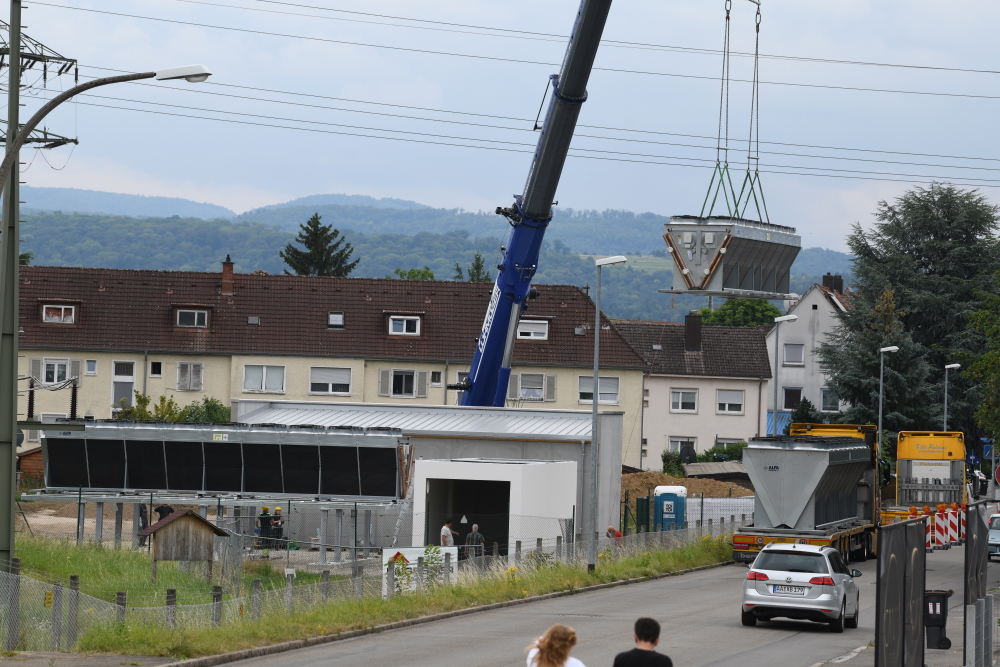 Rheinfelden, 17. Juli 2020. Massive Großbauteile wurden in dieser Woche für die neu entstehende Energiezentrale an der Schildgasse angeliefert. Die Zentrale bildet das Herzstück für die Wärmeverteilung in die Nahwärmenetze, für die Energiedienst Abwärme aus industriellen Prozessen der Evonik nutzt. Ein Autokran platzierte eine 50 Tonnen schwere Einhausung für Dampfturbinen auf dem Gelände und hob drei 5 Tonnen schwere Kühler auf eine zuvor erbaute Stahlkonstruktion. Insgesamt dauerte die Maßnahme anderthalb Tage.