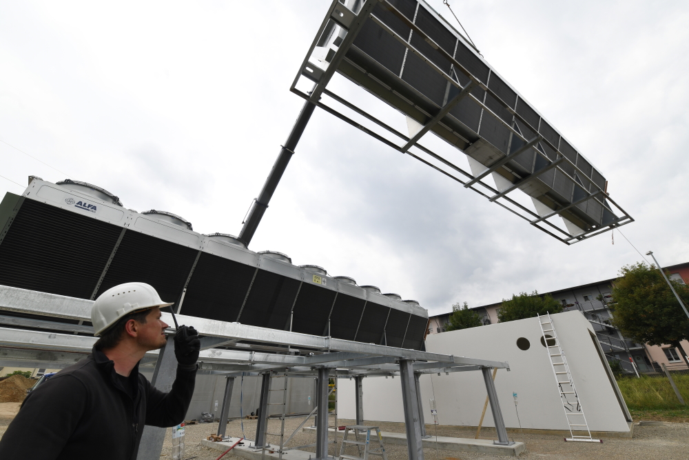 und Bild 2: Ein 250-Tonnen-Autokran hebt die je fünf Tonnen schweren „Tischkühler“ in Position. Bild: Energiedienst/ Juri Junkov