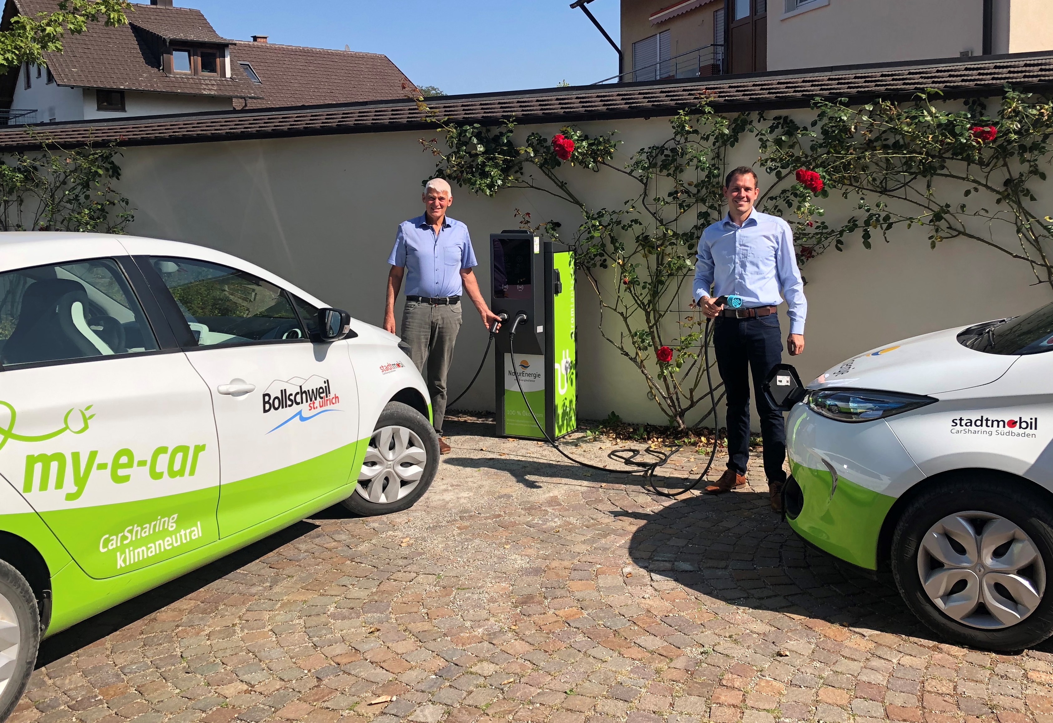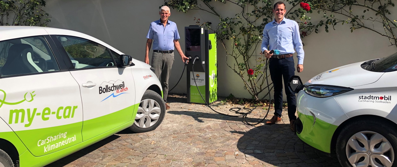 Bild: Bollschweil hat nun eine öffentliche Ladesäule (v. li.): Bürgermeister Josef Schweizer und Jörg Bleile, Kommunalbetreuer bei Energiedienst, eröffnen die Ladesäule auf dem Rathausparkplatz in der Hexentalstraße 56.