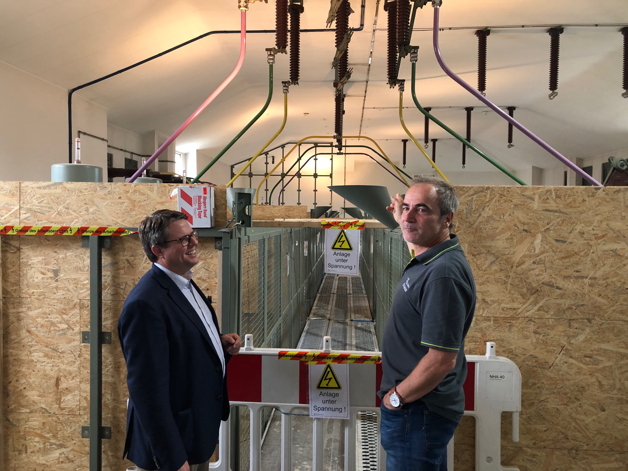 Bild: Projektleiter Rainer Beck (r.) von der ED Netze GmbH erläutert Bürgermeister Dr. Tobias Benz den Stand der Umbauarbeiten im Umspannwerk Wyhlen.