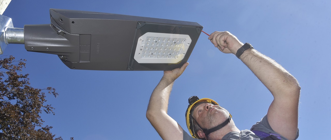 Bild: ED-Netze-Monteur Ralf Tröndle installiert eine neue LED-Leuchte.