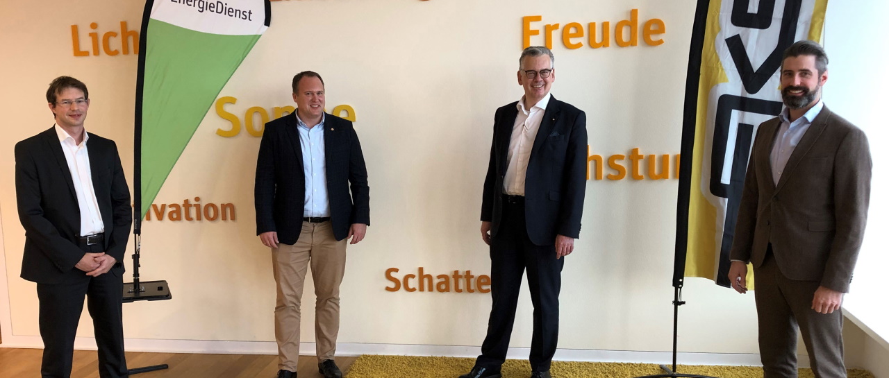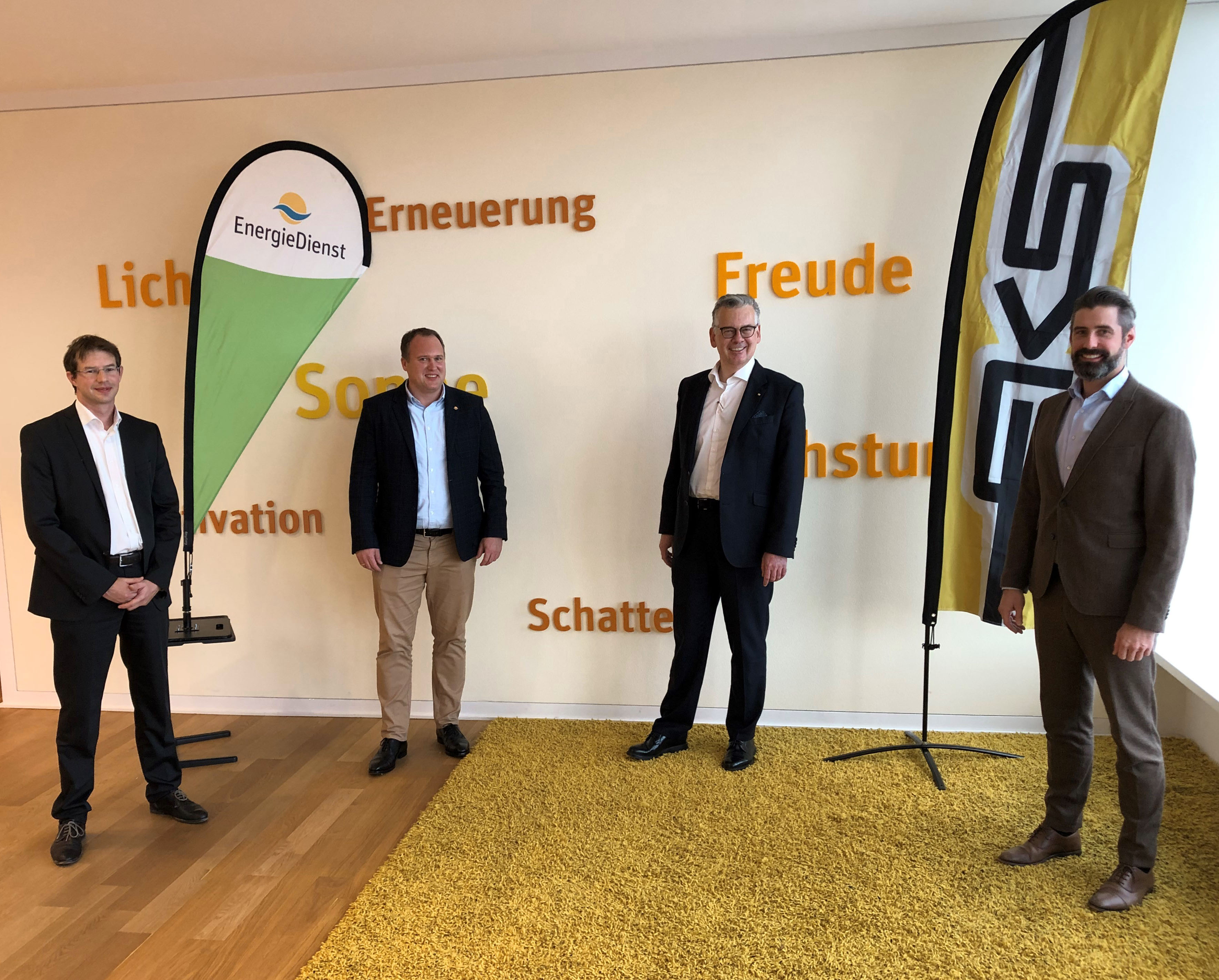 Pressefoto: Thomas Hoyer (Leiter Recht) und Jörg Reichert (Vorsitzender der Geschäftsleitung) von Energiedienst sowie Thomas Fischer (CEO) und Luca Slanzi (CFO) von EKS (v. l.) nach der Einigung.