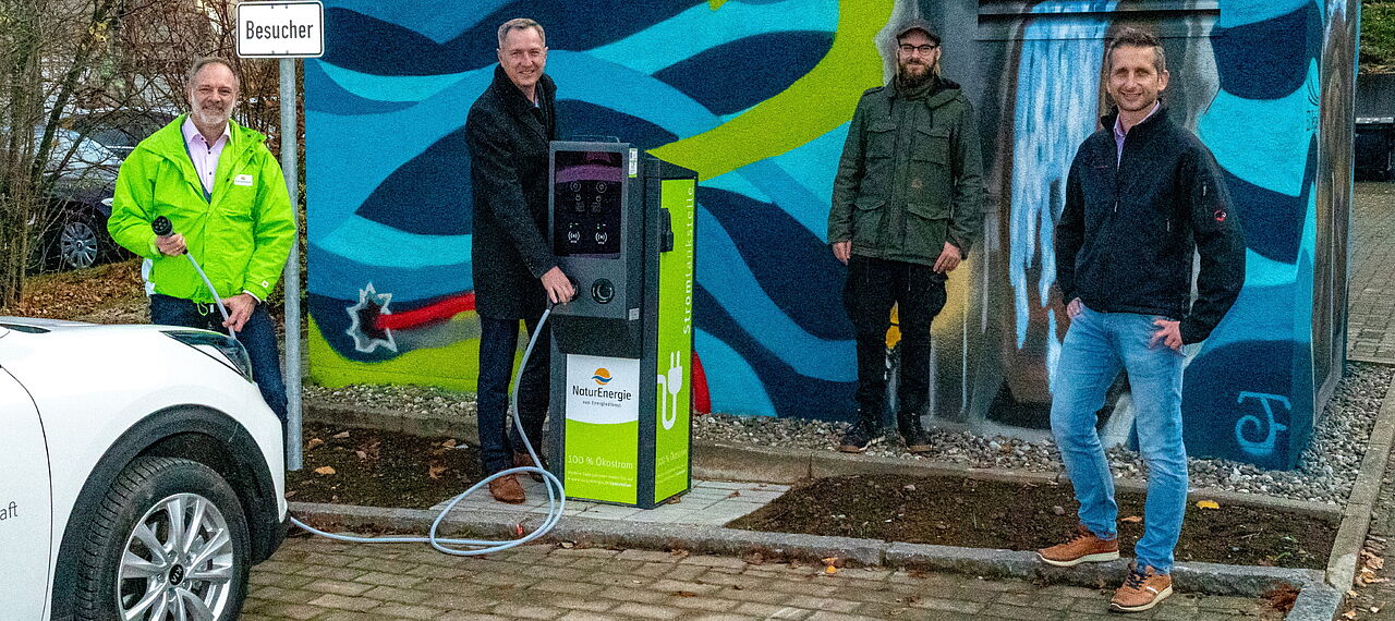 Bild: Energiedienst-Kommunalbetreuer Edmund Martin (von links), Bürgermeister Michael Schmitt, Graffiti-Künstler Jonas Fehlinger und Ortsbaumeister Patrick Lutz nehmen die Ladestation in Betrieb. Bild: Hans-Jürgen Götz.