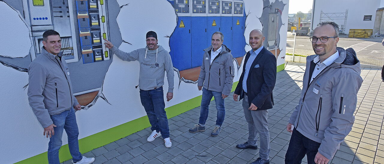 Bild 2: Einen Einblick ins technische Innenleben der neuen Schaltstation in Immendingen gibt das Graffiti von Jochen Laufer. Benjamin Fritzsche (ED Netze), Künstler Jochen Laufer, Rainer Beck (ED Netze), Bürgermeister Manuel Stärk und Thomas Sauter (Kommunalbetreuer ED Netze). Foto: Roland Sigwart / ED Netze GmbH