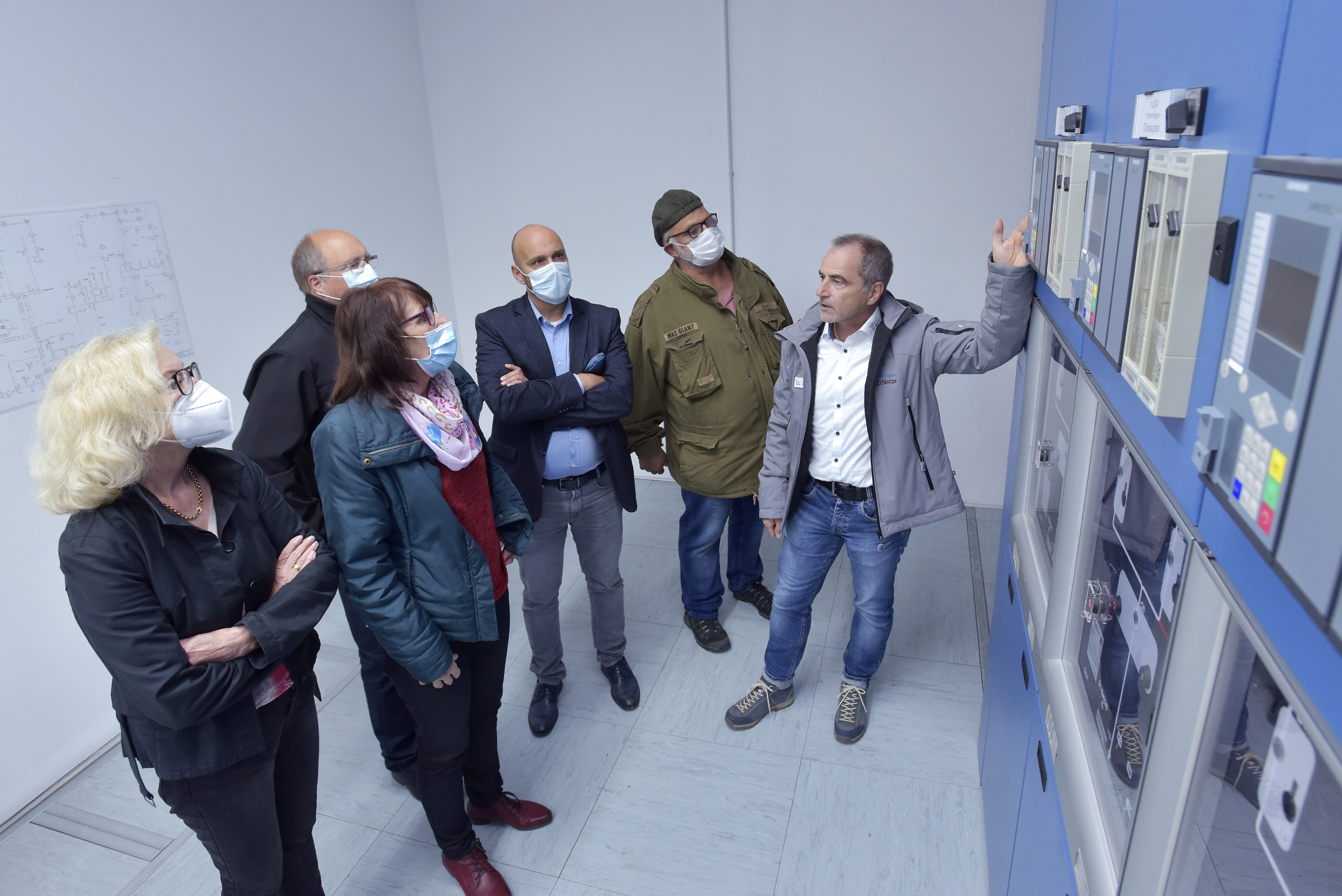 Bild 1: Rainer Beck (ED Netze GmbH) erklärt Bürgermeister Manuel Stärk (Dritter von rechts) und Gemeinderäten die Funktion der neuen Schaltanlage. Foto: Roland Sigwart / ED Netze GmbH
