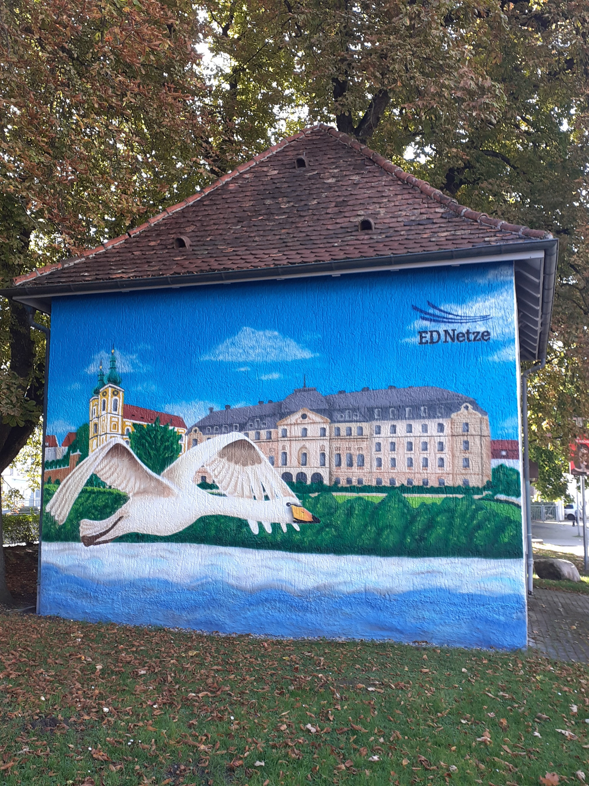 Bevor der Künstler loslegen konnte, musste die komplette Fassade mit einem Dampfreiniger gesäubert werden. Danach haben ED Netze-Monteure Lüftungsschlitze abgedeckt und Kabeleingänge verlegt, um Platz für das Kunstwerk zu schaffen. „Wir sind begeistert vom Ergebnis“, freut sich Edmund Martin, Kommunalbetreuung ED Netze GmbH.