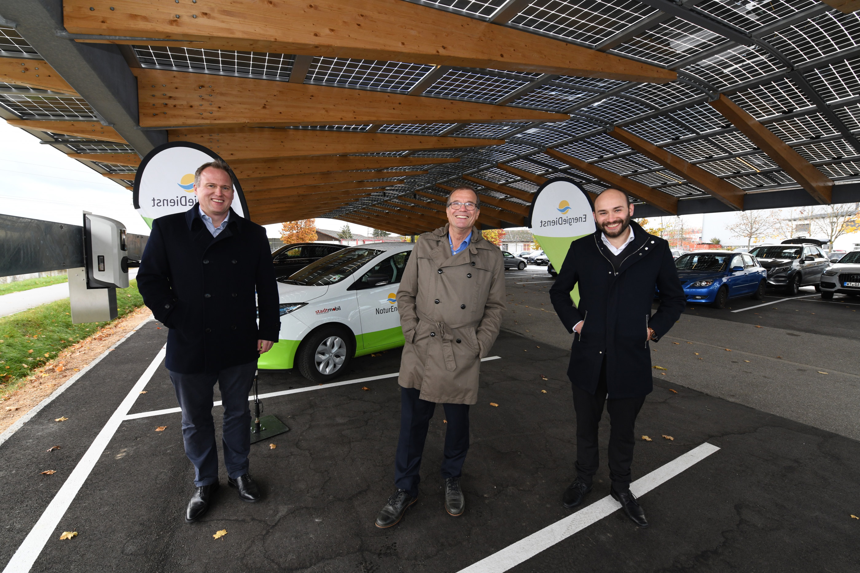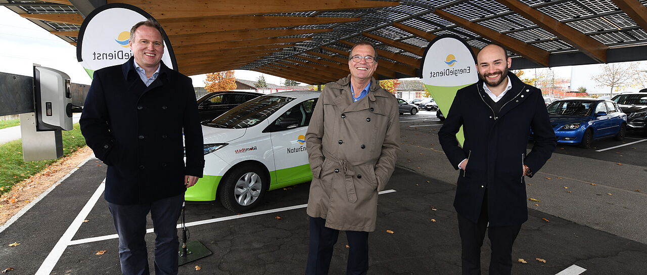 Bild 1: Jörg Reichert, Vorsitzender der Energiedienst Holding AG, Klaus Eberhardt, Oberbürgermeister von Rheinfelden, und Nils Hoesch, Leiter E-Mobility bei Energiedienst, freuen sich über den neuen PV-Carport in Rheinfelden (von links). Foto: Juri Junkov / Energiedienst AG