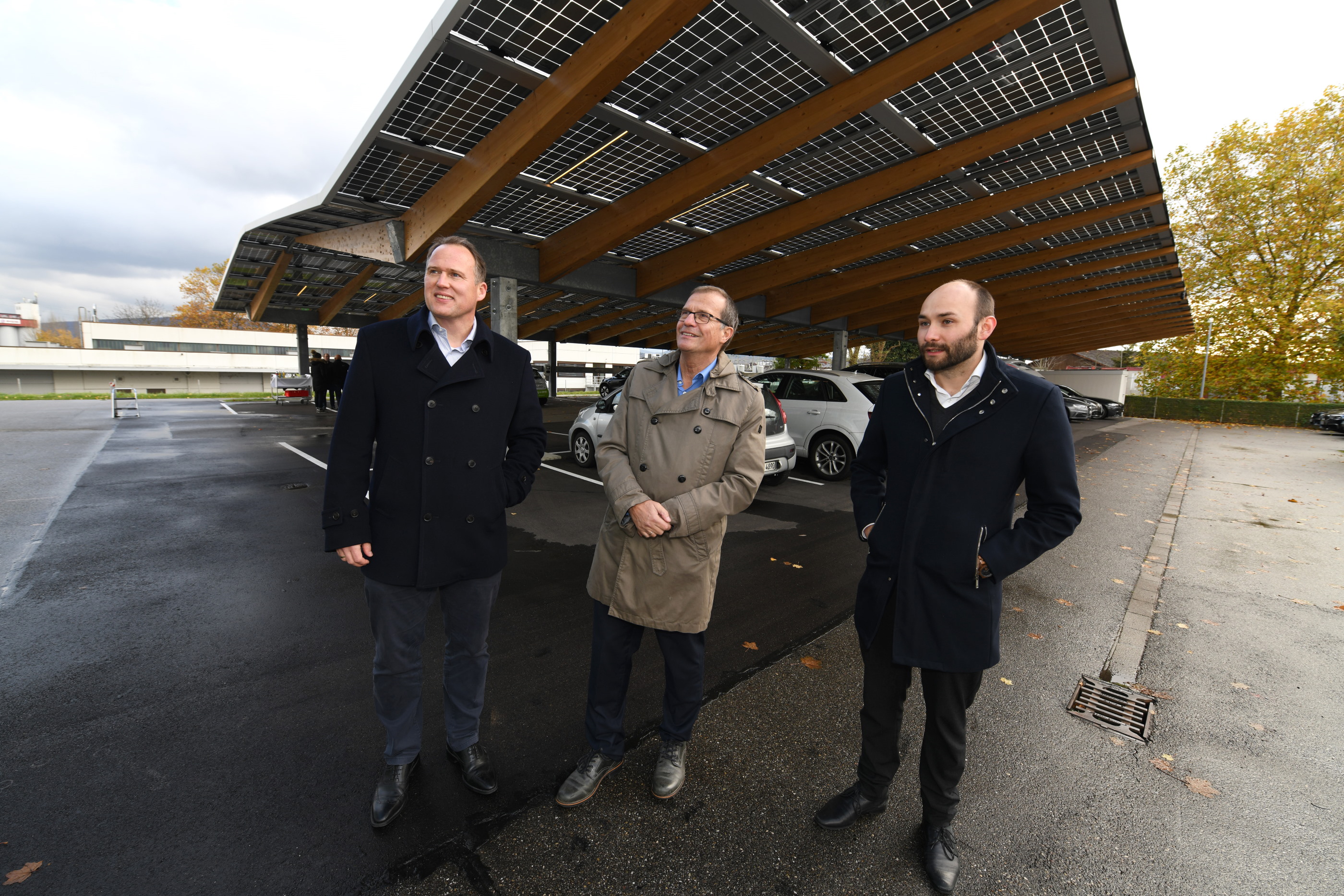 Bild 2: Mehr als nur eine Parkplatzüberdachung. Jörg Reichert, Vorsitzender der Energiedienst Holding AG, Klaus Eberhardt, Oberbürgermeister von Rheinfelden, und Nils Hoesch, Leiter E-Mobility bei Energiedienst, vor dem neuen PV-Carport (von links). Foto: Juri Junkov / Energiedienst AG