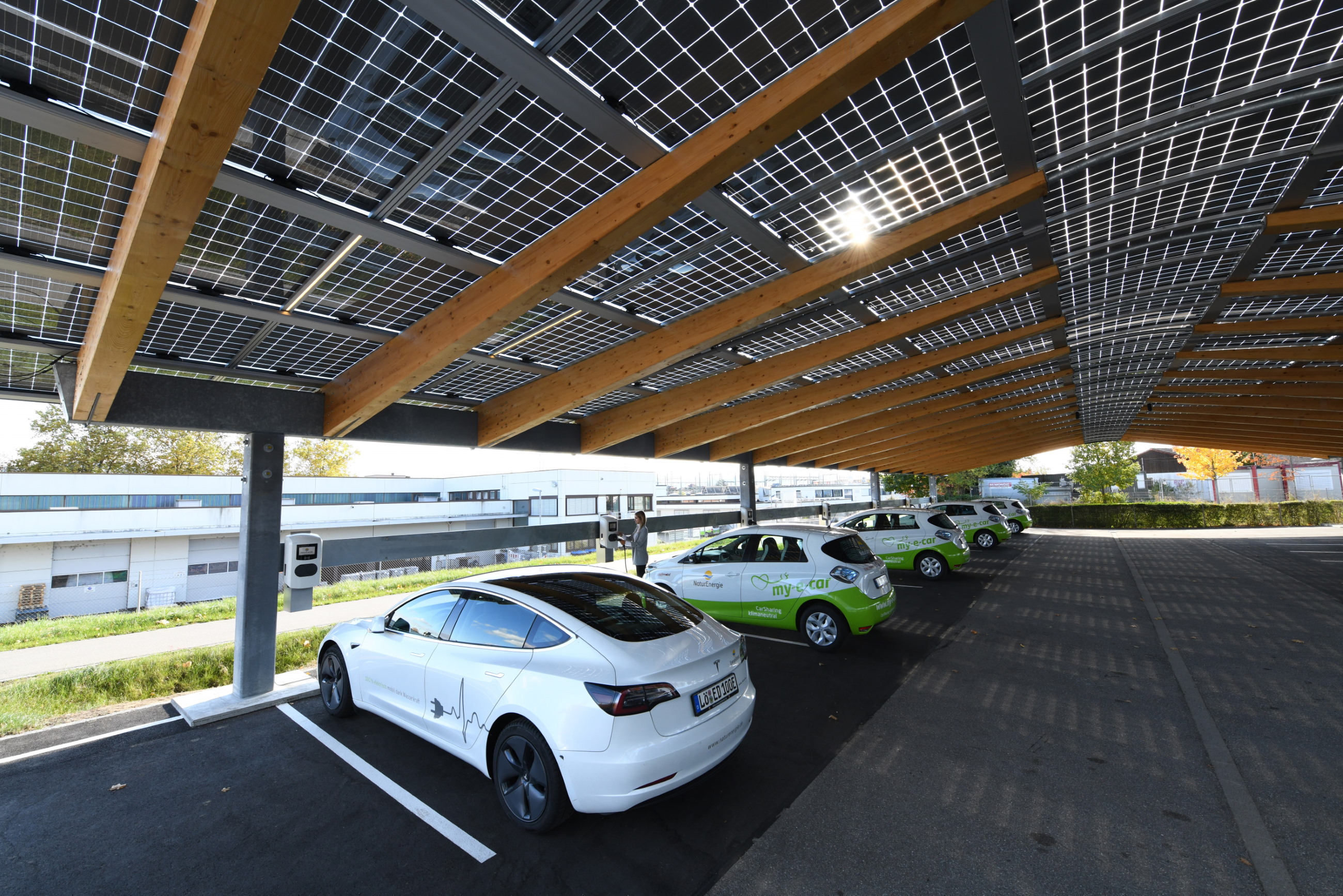 Bild 3: Der neue PV-Carport verfügt über 38 überdachte Parklätze, davon 14 mit Wallbox, erweiterbar auf 28 Wallboxen. Foto: Juri Junkov / Energiedienst AG