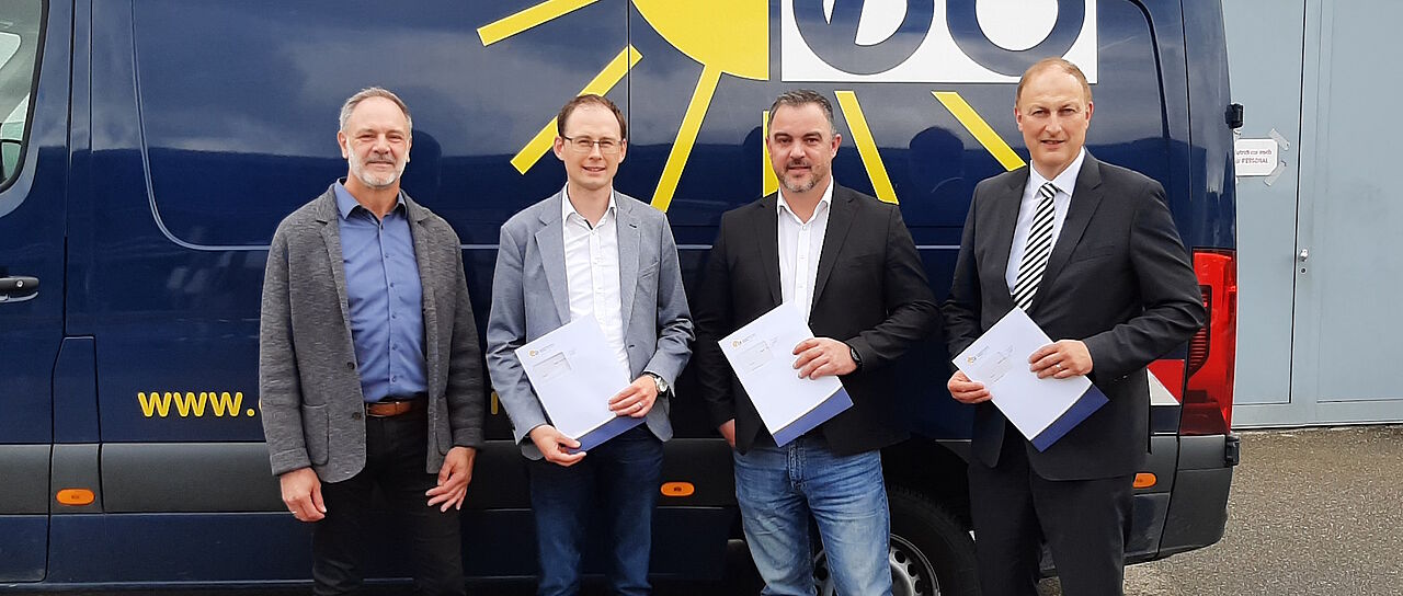 Bild: Energieversorgung Südbaar GmbH & Co. KG (ESB) ist jetzt 100-prozentige Tochtergesellschaft der Energiedienst Holding AG (Energiedienst): Michael Kollmeier, Markus Keller, Micha Bächle und Edmund Martin (v.r.n.l.) nach der Unterzeichnung des Kaufvertrages. Foto: Energieversorgung Südbaar