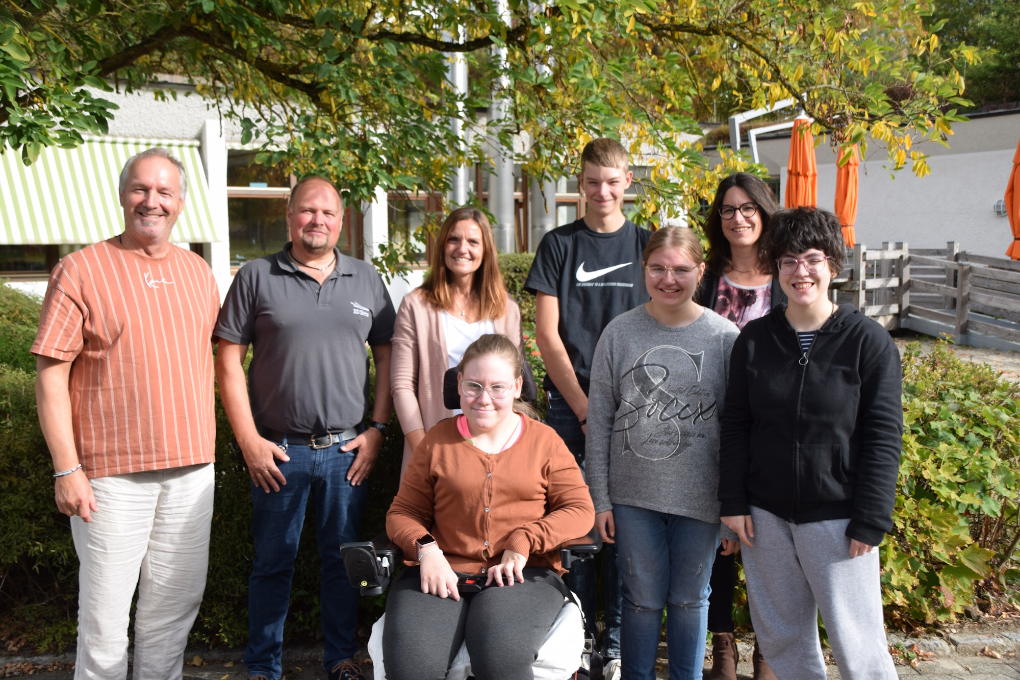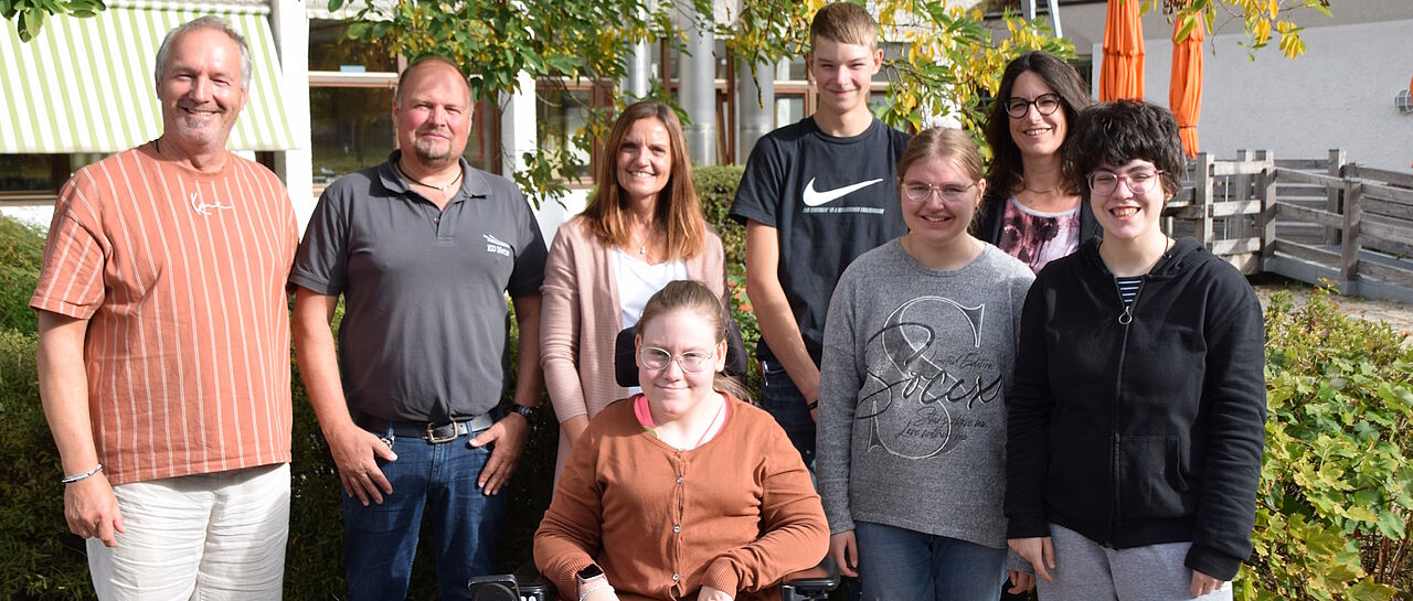 Bild: Mit 3.000 Euro unterstützen die naturenergie-Mitarbeitenden die Christy-Brown-Schule in Villingen-Schwenningen. Von links: Lehrer Markus Fischer, Jürgen Birkenberger und Heidi Hörenz (naturenergie) sowie stellvertretende Schulleiterin Kerstin Greimel (rechts hinten) und einige Schüler. Foto: Christy-Brown-Schule