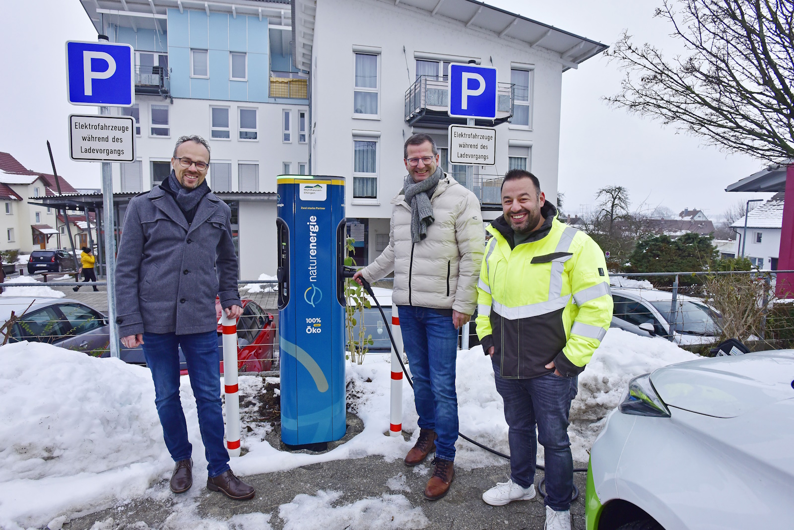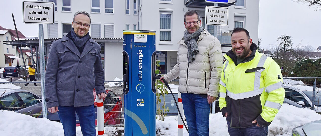 Bild: Neue öffentliche E-Ladestation in Mühlhausen-Ehingen: Thomas Sauter, Kommunalbetreuer, Bürgermeister Patrick Stärk und Projektleiter Giuseppe Castiglione bei der Eröffnung (von links). Foto: Roland Sigwart / naturenergie