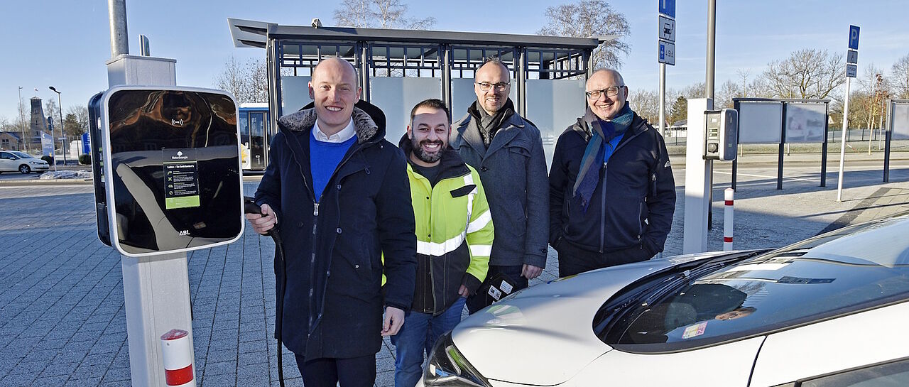 Bild: Neue öffentliche E-Ladestation in Bad Dürrheim: Thomas Sauter, Kommunalbetreuer, Bürgermeister Jonathan Berggötz, Projektleiter Giuseppe Castiglione und Joachim Petelka vom Kundenbereich Tiefbau der Stadtverwaltung bei der Eröffnung (von links). Foto: Roland Sigwart / naturenergie