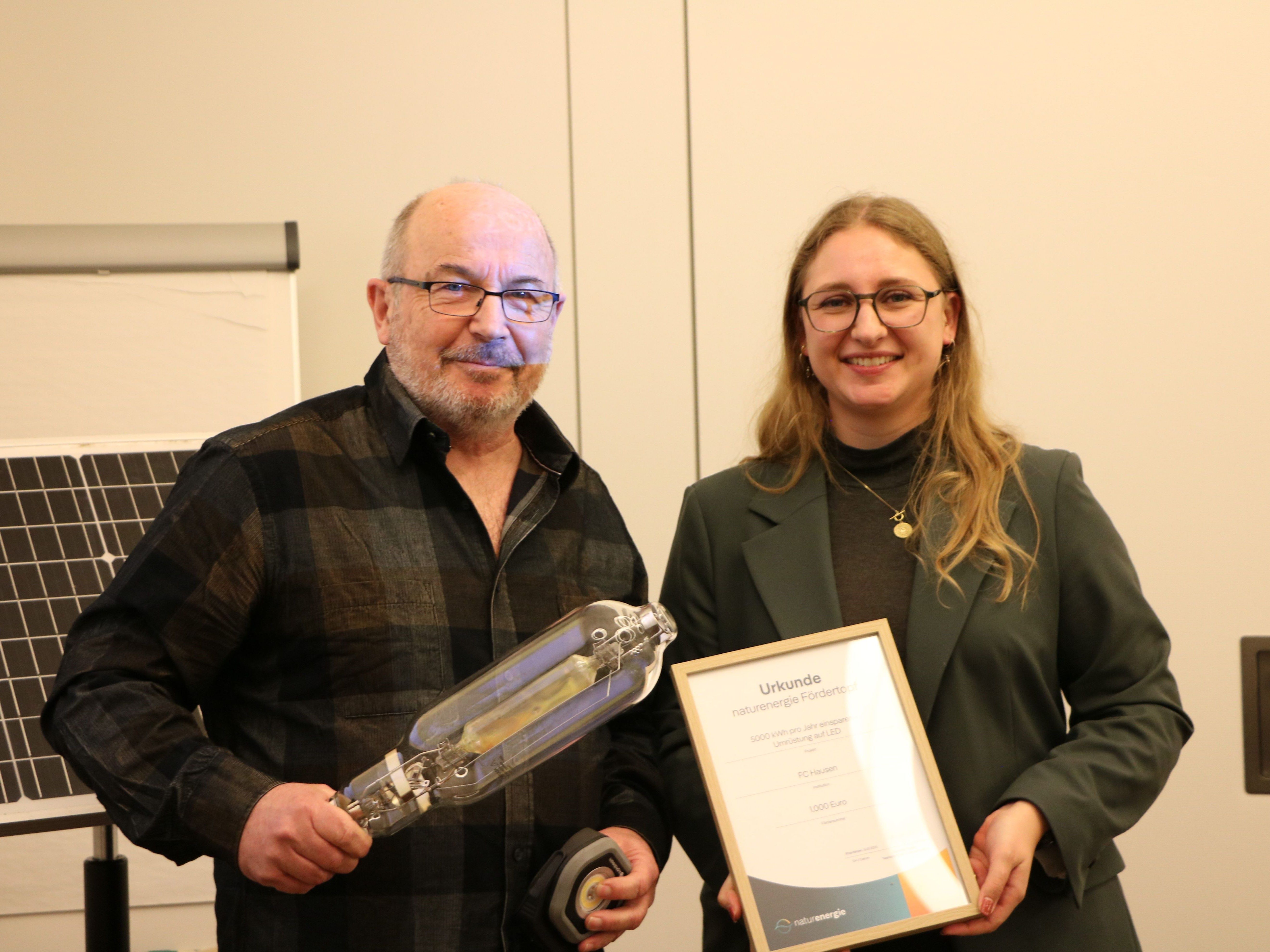 Foto 2: Holger Keller, Vorsitzender des FC Hausen, nimmt die Urkunde von Michelle Moyzes entgegen. Bild: naturenergie