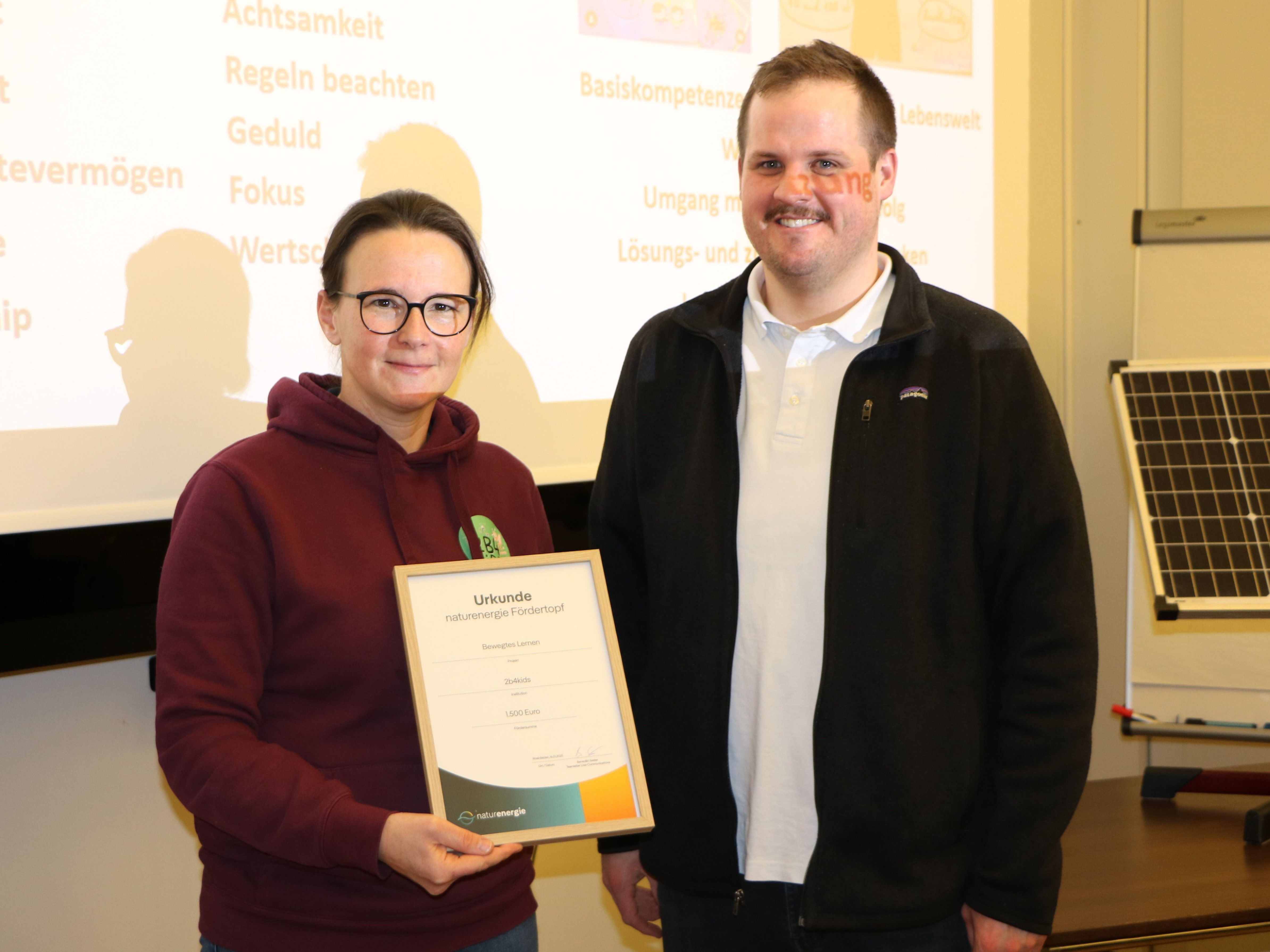 Foto 3: Stephanie Müller, Gründerin des Programms „2b4kids“ aus Rheinfelden, freut sich über die Urkunde aus den Händen von Benedikt Sester. Bild: naturenergie