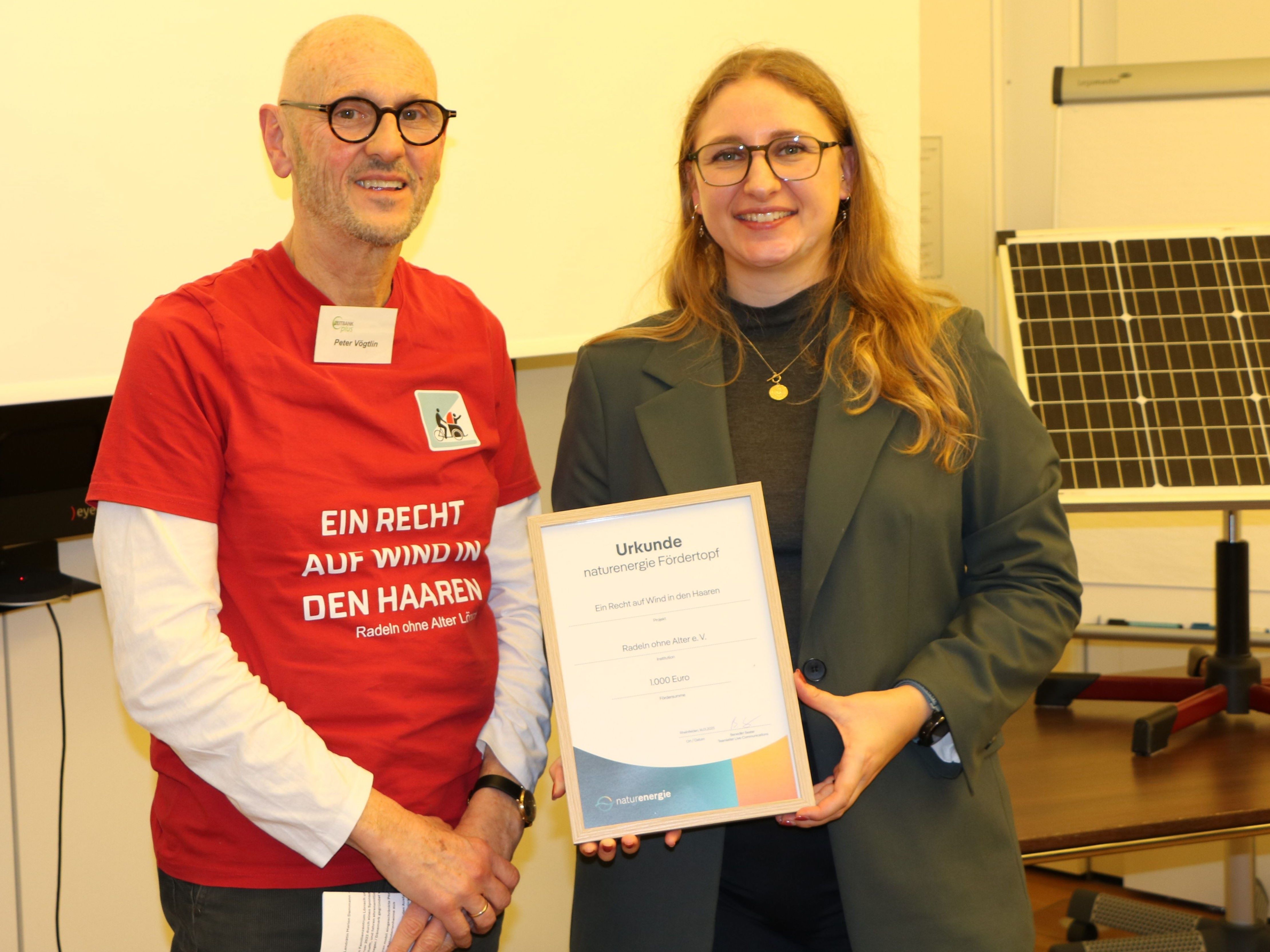 Foto 4: Peter Vögtlin vom Verein „Radeln ohne Alter" aus Lörrach nimmt die Urkunde von Michelle Moyzes entgegen. Bild: naturenergie