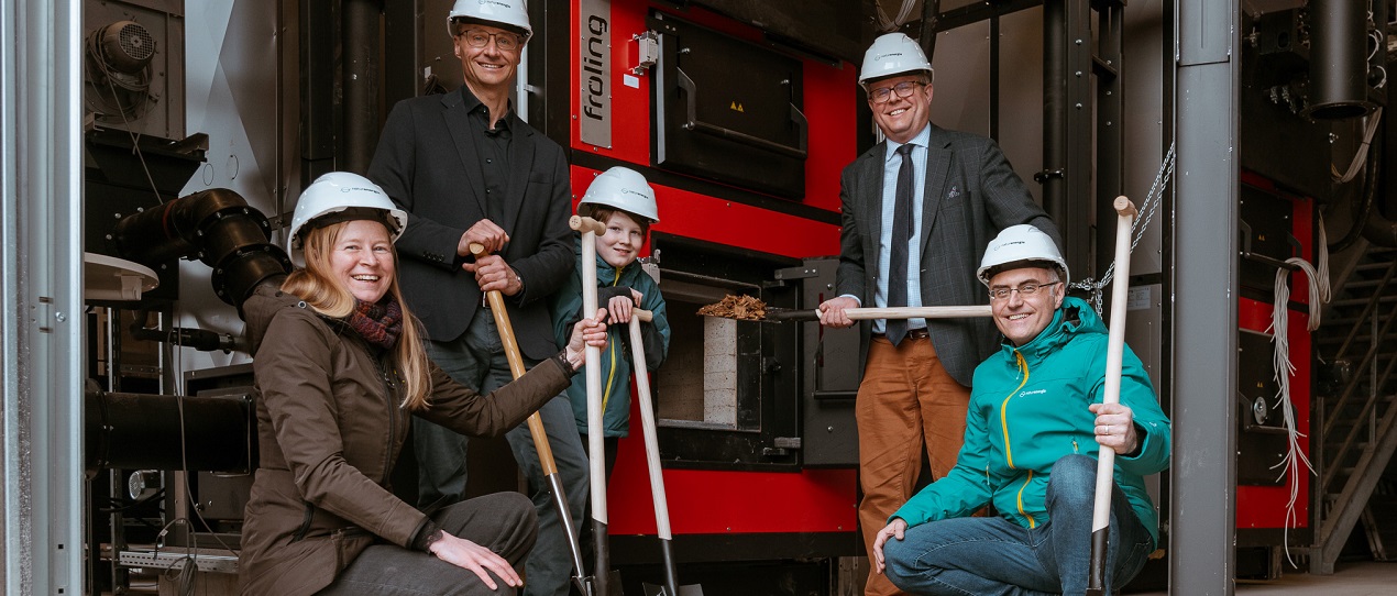 Bild: Die neue Heizzentrale am Kraftwerk Wyhlen ist einsatzbereit – sehr zur Freude von (v. l.) Christin Biermann (Gemeinde Grenzach-Wyhlen), Daniel Schölderle (Mitglied Geschäftsleitung naturenergie holding AG), Paul Biermann, Bürgermeister Dr. Tobias Benz und Projektleiter Daniel Streich. Foto: naturenergie hochrhein AG
