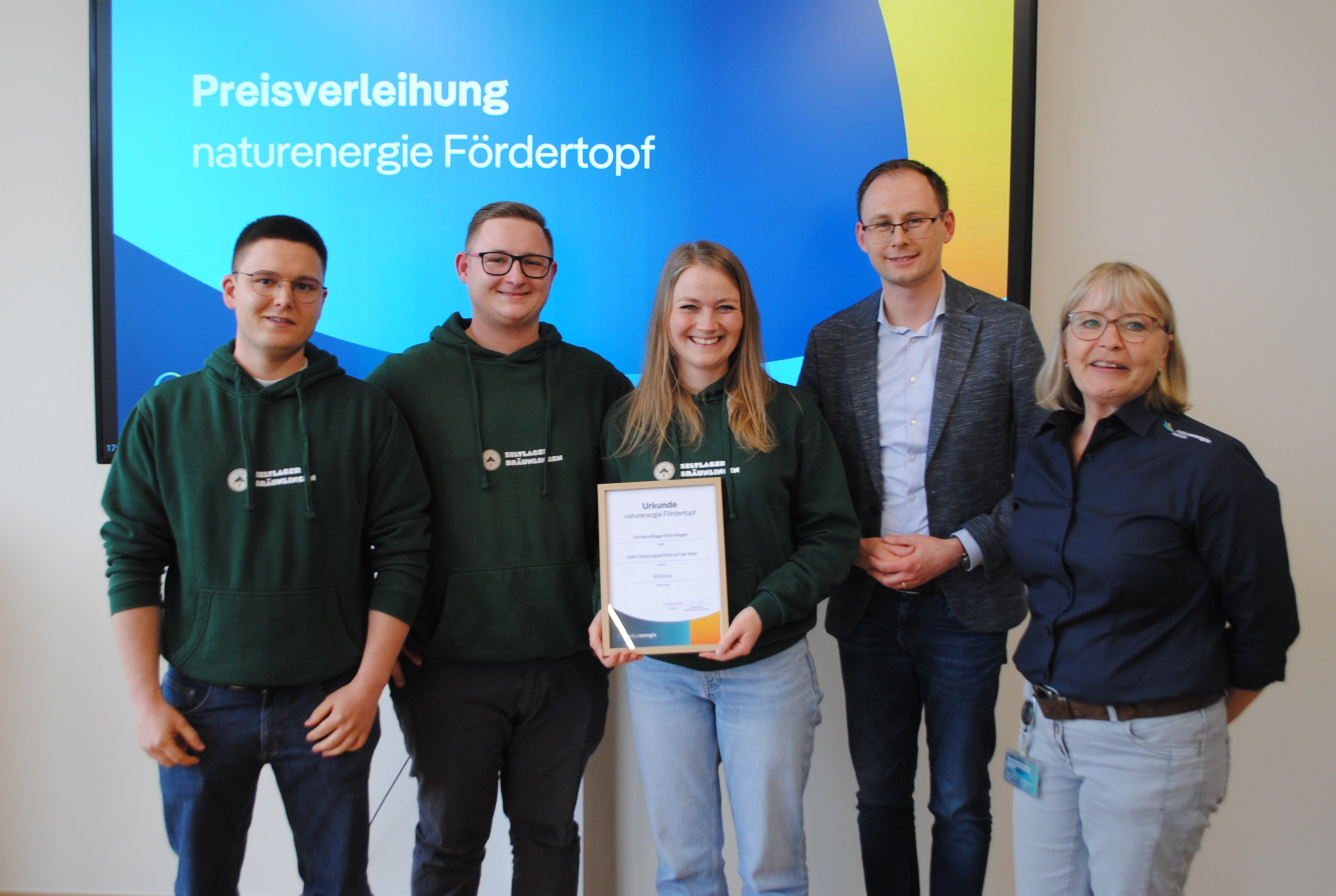 Foto 2: 500 Euro Preisgeld gehen an das Zeltlager der katholischen Seelsorgeeinheit auf der Baar. Moritz Baum, Philipp Schaupp, Leonie Dieterle und der Bräunlinger Bürgermeister Micha Bächle nehmen die Urkunde von Eva Buchmeier von der Kommunalbetreuung der naturenergie netze GmbH (von links) entgegen. Foto: Juliane Schlichter / naturenergie hochrhein AG