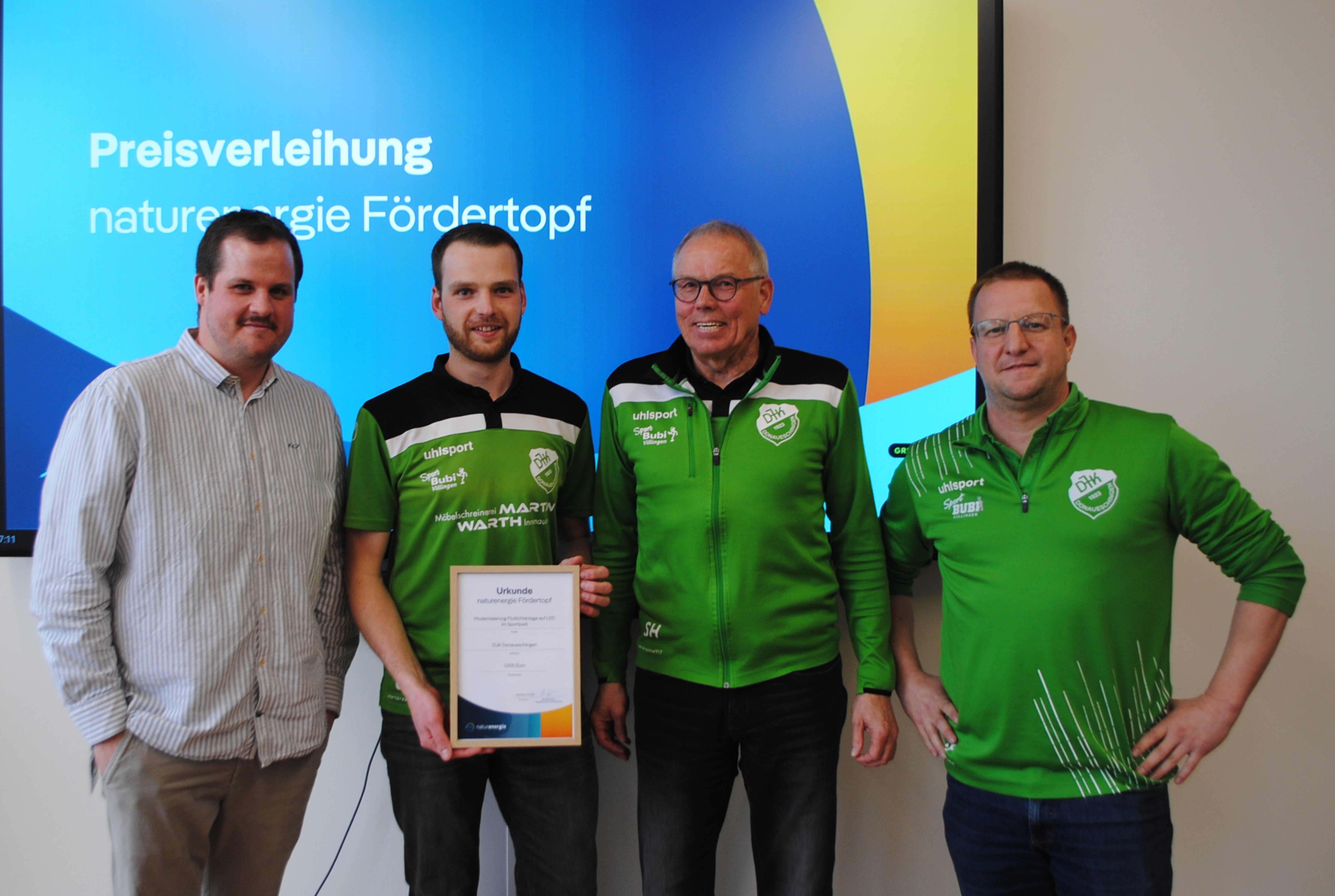Foto 3: Benedikt Sester, Teamleiter Sponsoring von naturenergie, überreicht die Urkunde an Oliver Rösch, Siegfried Held und Sebastian Früh vom DJK Donaueschingen. Der Verein erhält 1.000 Euro Preisgeld. Foto: Juliane Schlichter / naturenergie hochrhein AG