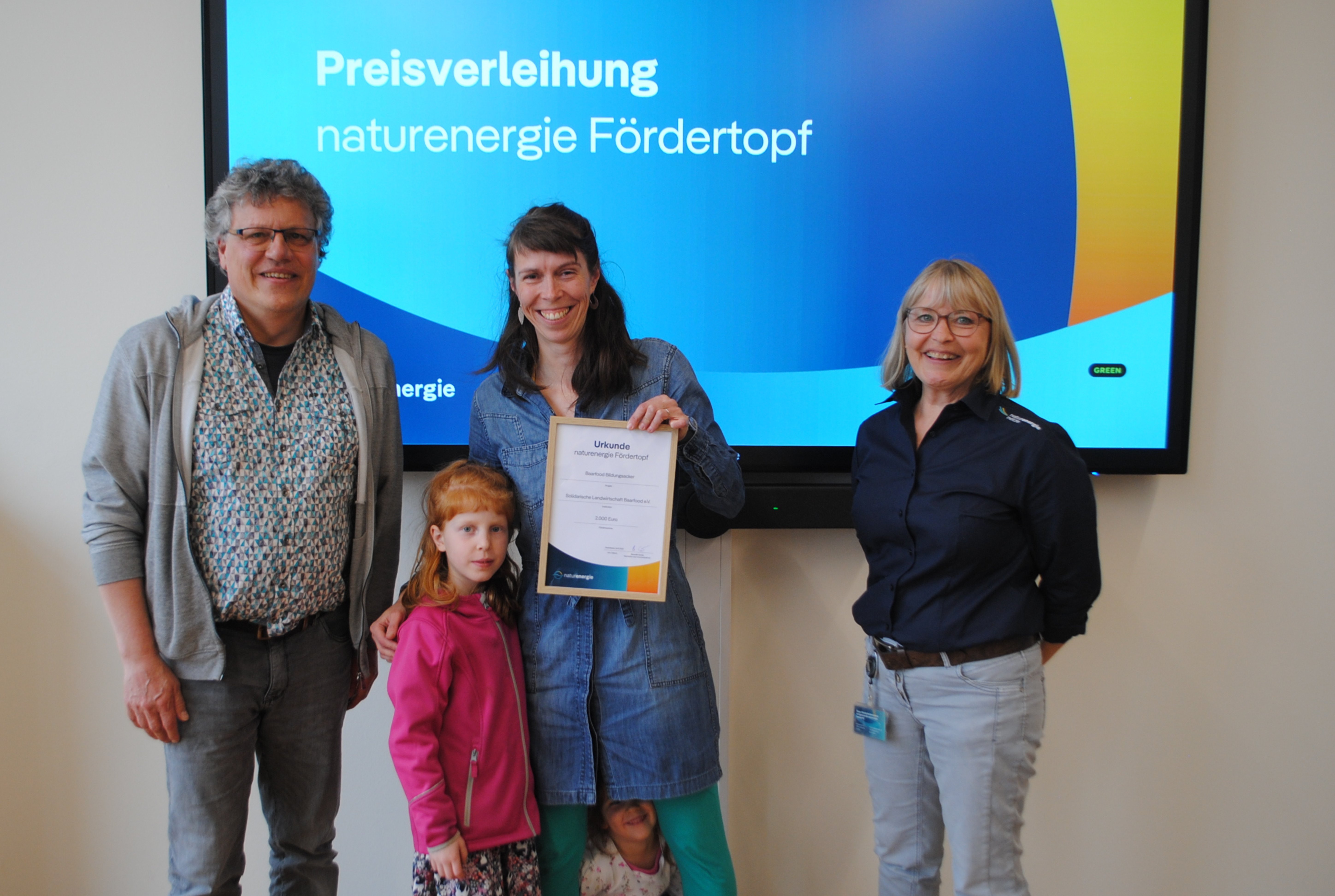 Foto 4: Stephanie Bender (Mitte) und ihre Kinder sowie Jürgen Muff freuen sich über die Urkunde und 2.000 Euro Preisgeld für die Solidarische Landwirtschaft Baarfood aus Villingen-Schwenningen. Mit ihnen freut sich Jurymitglied Eva Buchmeier. Foto: Juliane Schlichter / naturenergie hochrhein AG
