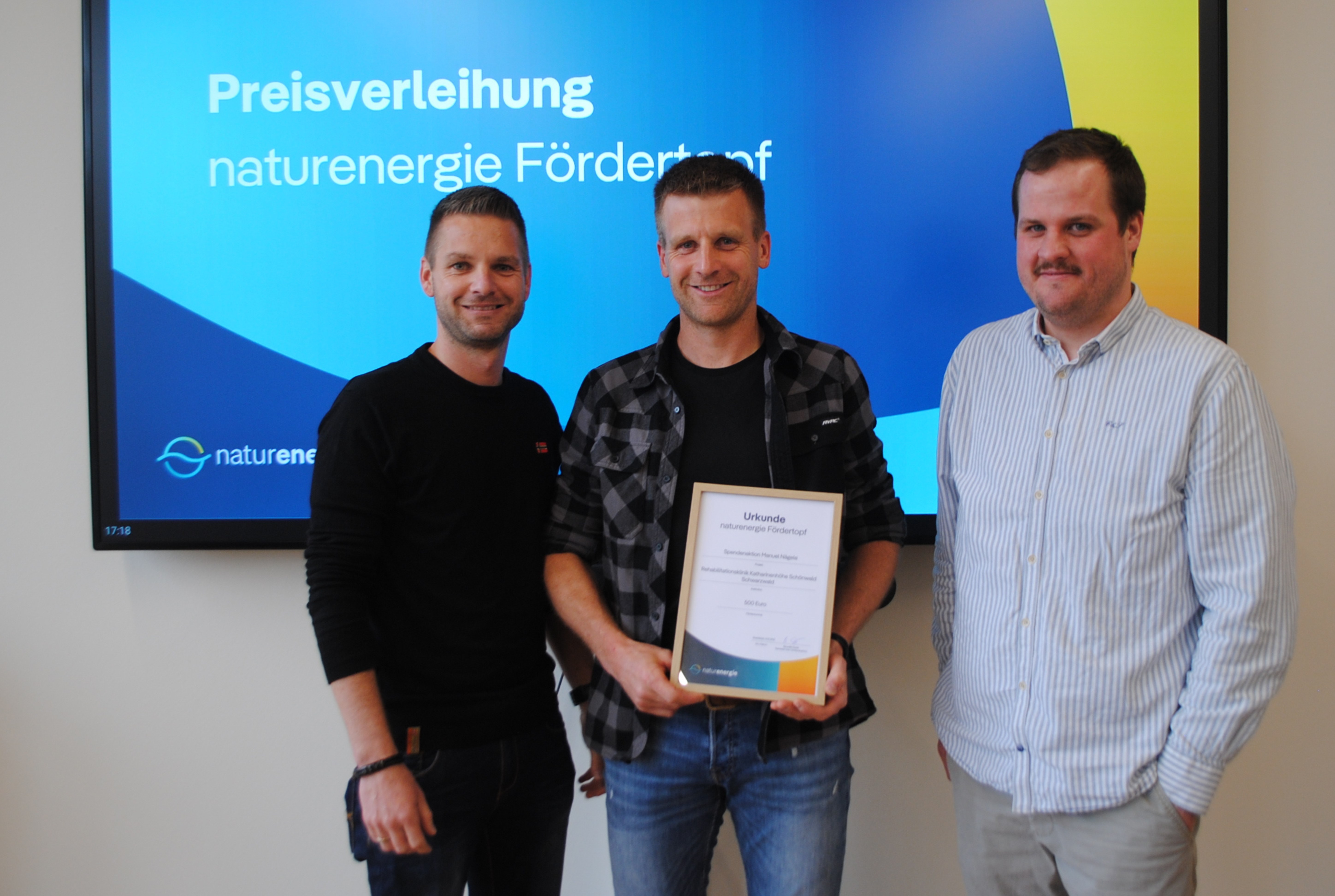 Foto 5: Die Brüder Alexander und Manuel Nägele nehmen die Urkunde von Benedikt Sester, Teamleiter Sponsoring bei naturenergie, entgegen (von links). Das Preisgeld von 500 Euro geht an die Rehabilitationsklinik Katharinenhöhe in Schönwald. Foto: Juliane Schlichter / naturenergie hochrhein AG