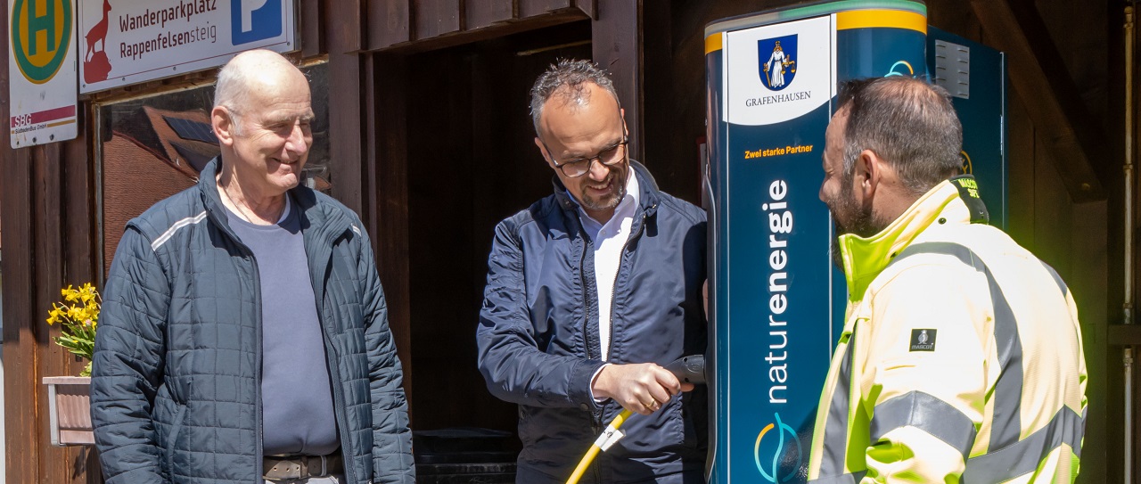 Grafenhausen, 7. April 2025. Grafenhausen macht einen großen Schritt in Richtung nachhaltige Mobilität: Ab sofort stehen zwei hochmoderne, öffentliche Ladestationen für Elektrofahrzeuge zur Verfügung. Die neuen 30-kW-Ladesäulen wurden von Bürgermeister Christian Behringer, Ortsvorsteher Peter Morath und Thomas Sauter, Kommunalbetreuer von naturenergie, eingeweiht. Eine Ladesäule befindet sich zentral am Rathausplatz, die andere im Johann-Anton-Morat-Weg im Ortsteil Staufen.