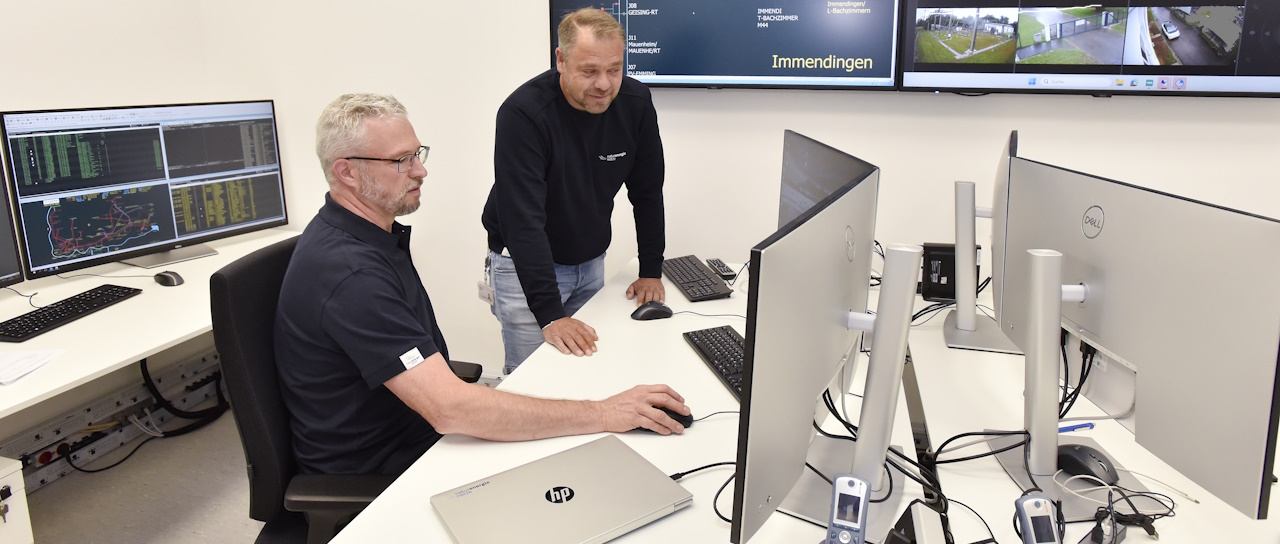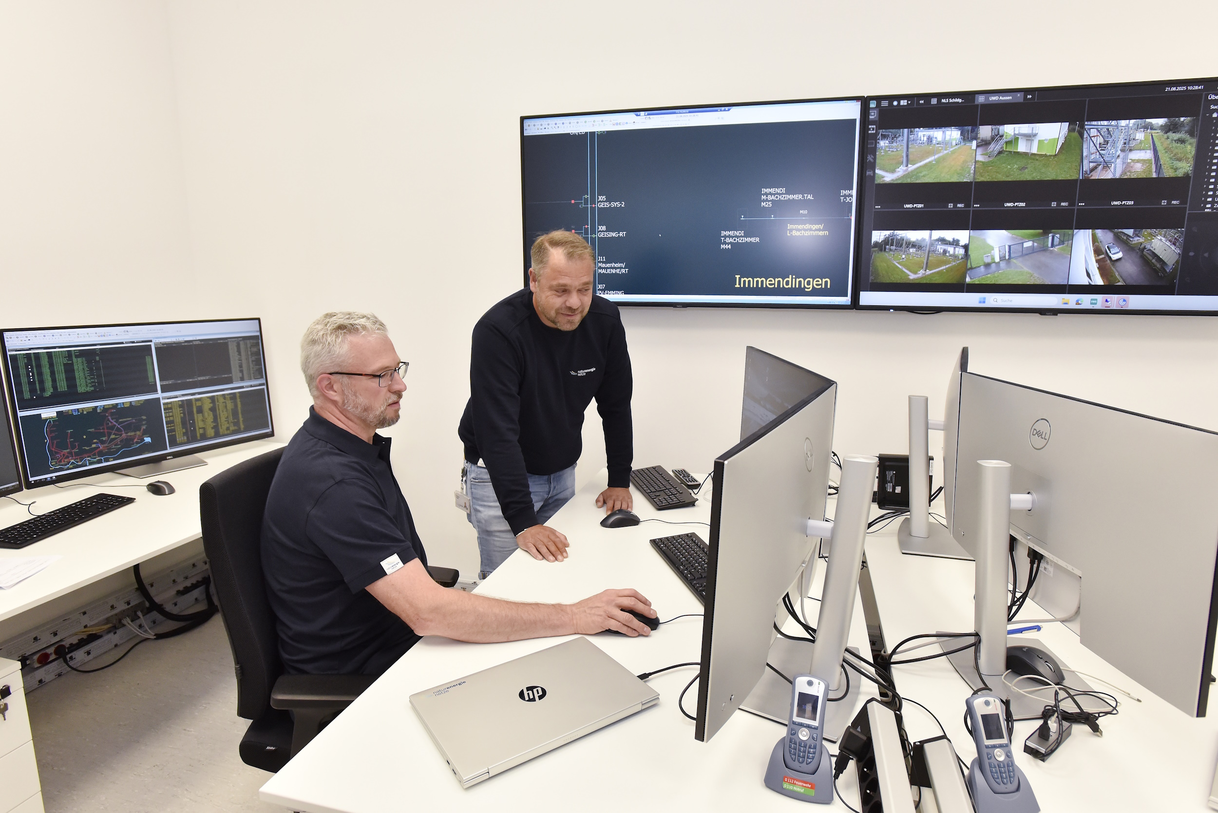 Bild: Die neue Notleitstelle in Donaueschingen: modern ausgestattet, räumlich getrennt und doppelt abgesichert. Vor Ort im Einsatz die Kollegen Stefan Merz und Mathias Huber (von links). Foto: Roland Sigwart / naturenergie netze GmbH