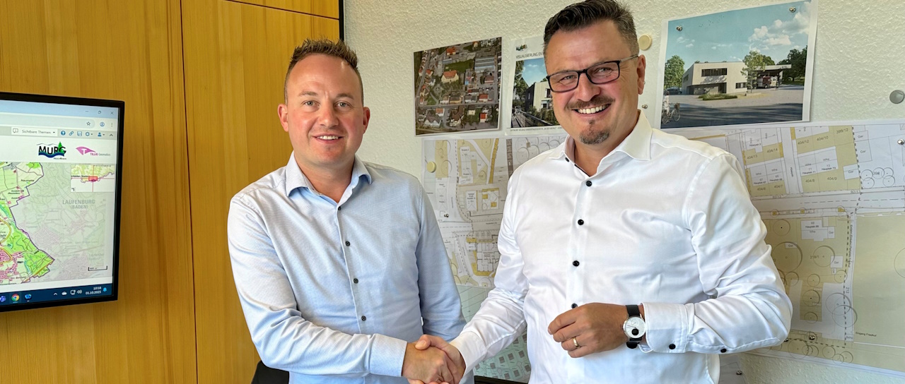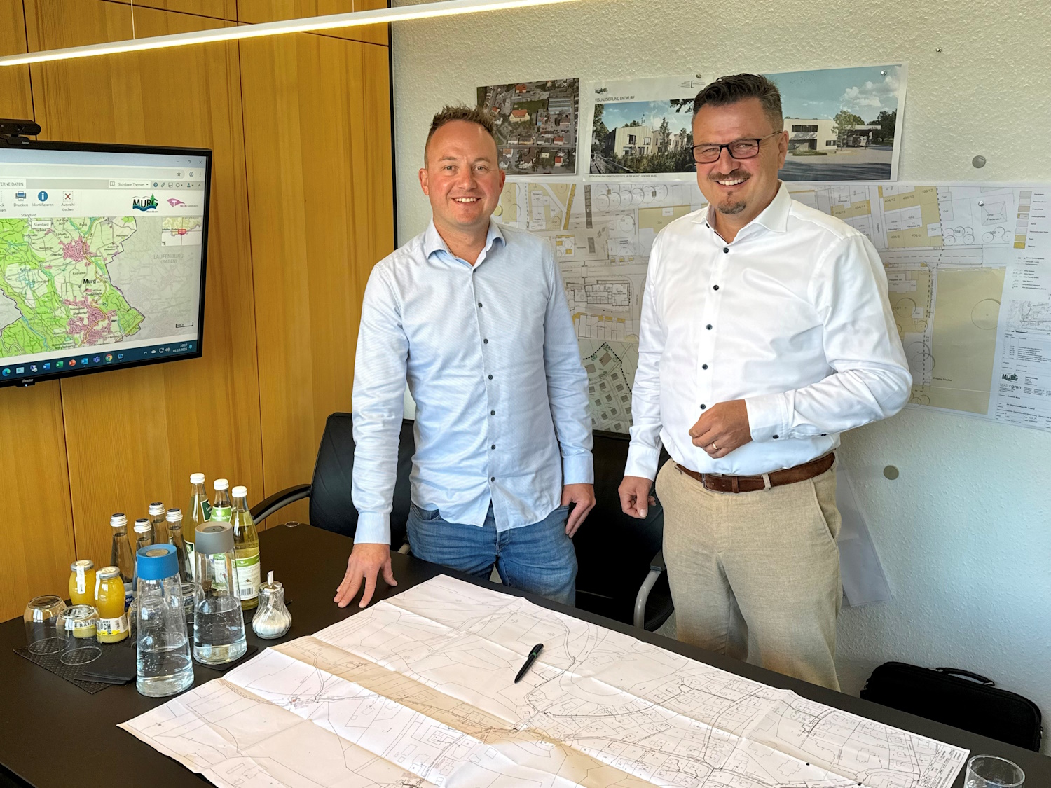 Bild: Bürgermeister Adrian Schmidle (rechts) und Baukoordinator Cedrick Kübeck bei der Projektvorstellung in Murg. Foto: naturenergie netze GmbH
