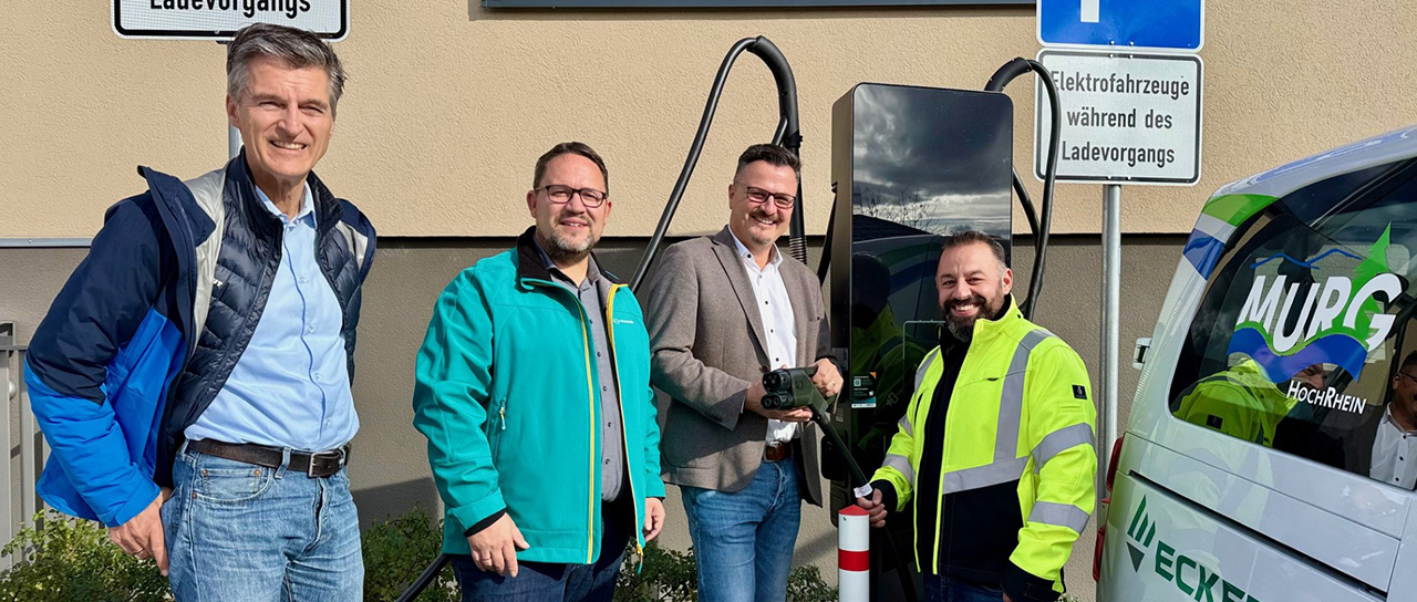 Bild: Neue öffentliche E-Ladestation in Murg eingeweiht: (v. l.) Klimaschutzmanager Frank Philipps, Kommunalbetreuer Roman Gayer (naturenergie), Bürgermeister Adrian Schmidle und Projektleiter Giuseppe Castiglione (naturenergie). Foto: Gemeinde Murg