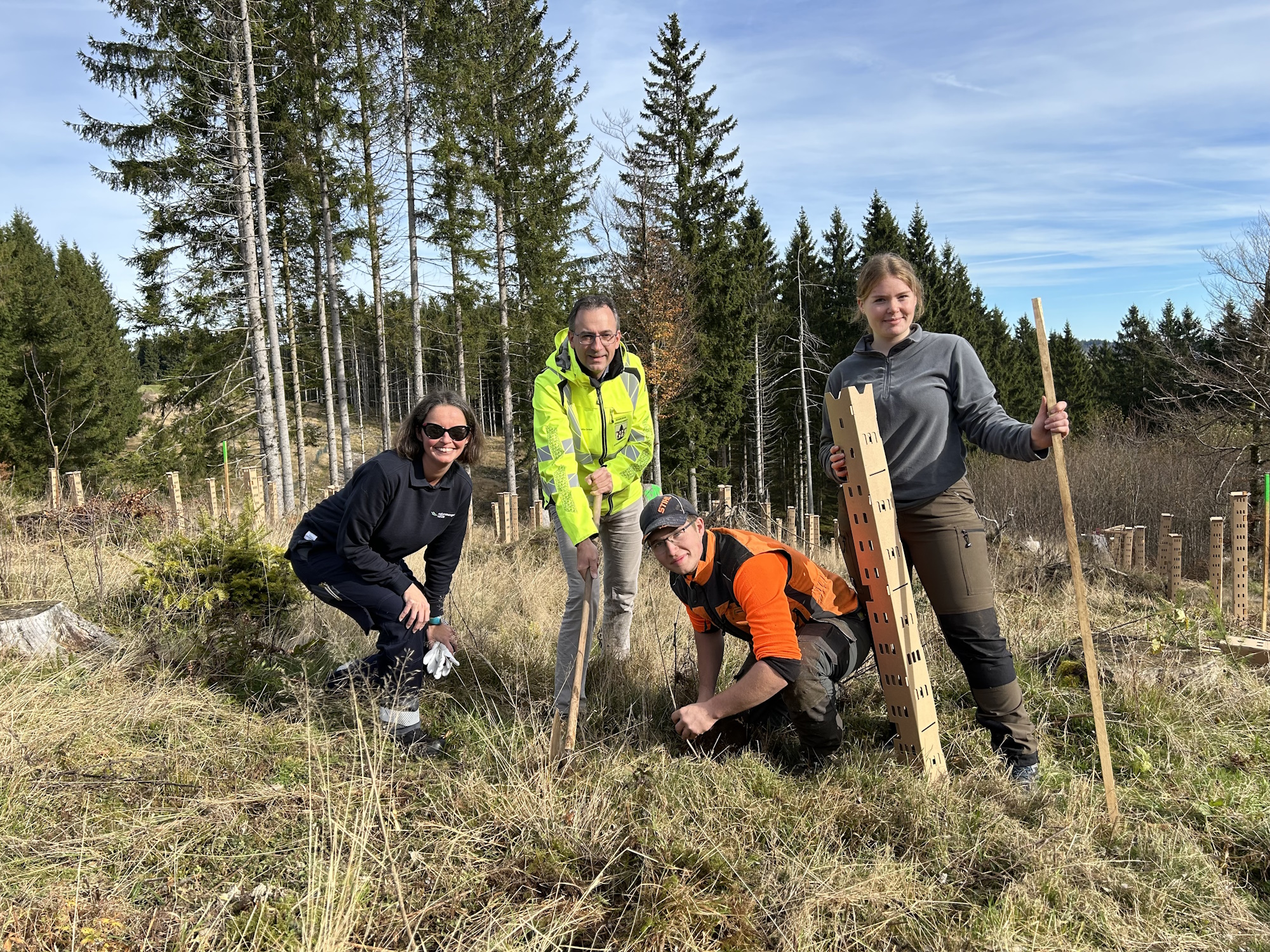 Die rund ein Hektar große Fläche wurde von der Holzhauerei Goldmann vorbereitet. Gepflanzt wurden klimaangepasste Mischbaumarten sowie ein artenreicher Waldrand mit Gehölzen wie Douglasie, Lärche, Bergahorn, Roteiche und Vogelkirsche. So entsteht ein stabiler, trockenheits- und sturmresilienter Bestand, der langfristig zur Artenvielfalt in der Region beiträgt.