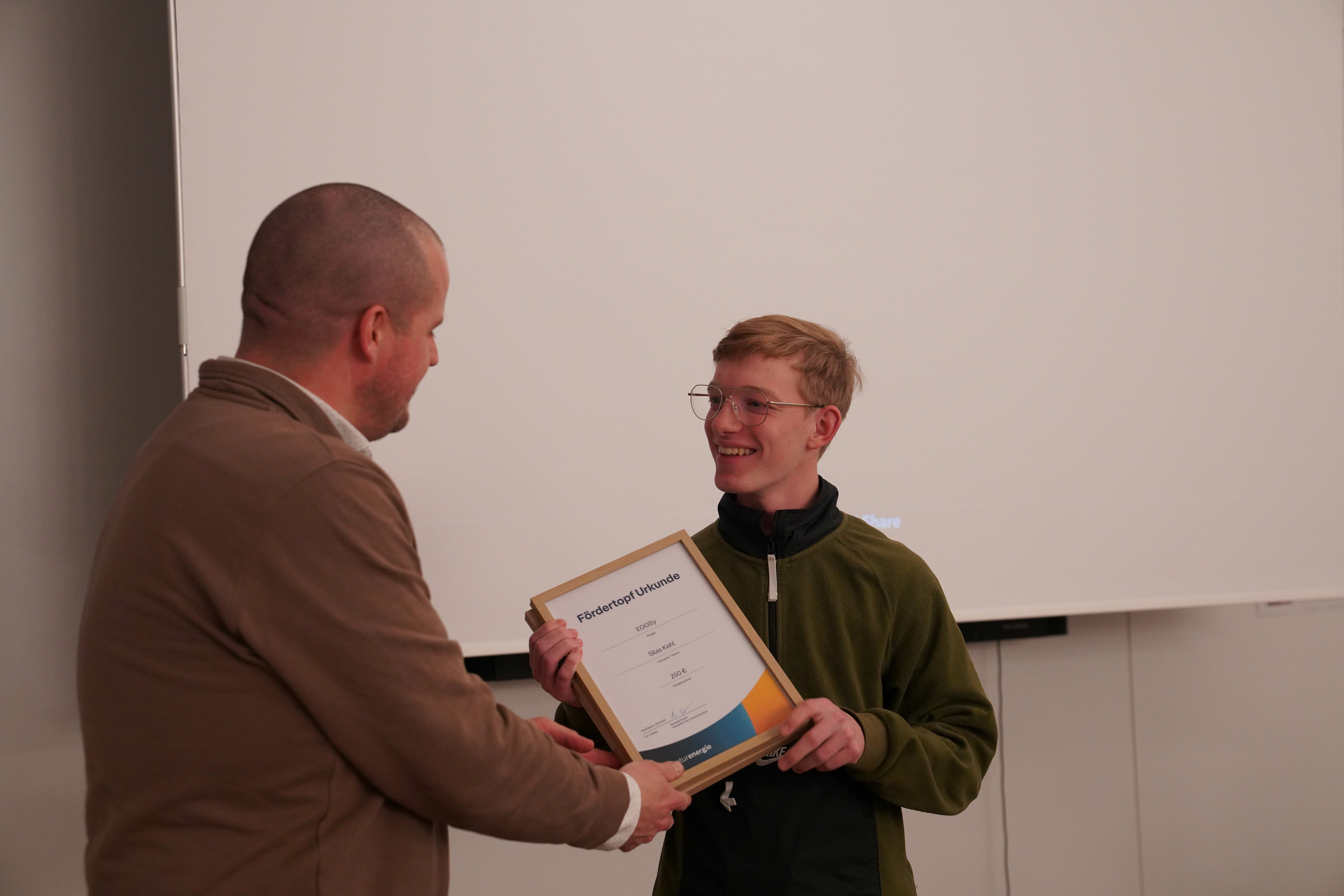 Foto 2: Benedikt Sester (links) überreicht Silas Kehl aus Bonndorf die Urkunde. Der Gymnasiast aus Bonndorf forscht an einer kostengünstigen Methode, um Rollstühle mithilfe von Gehirnströmen zu steuern. Foto: naturenergie