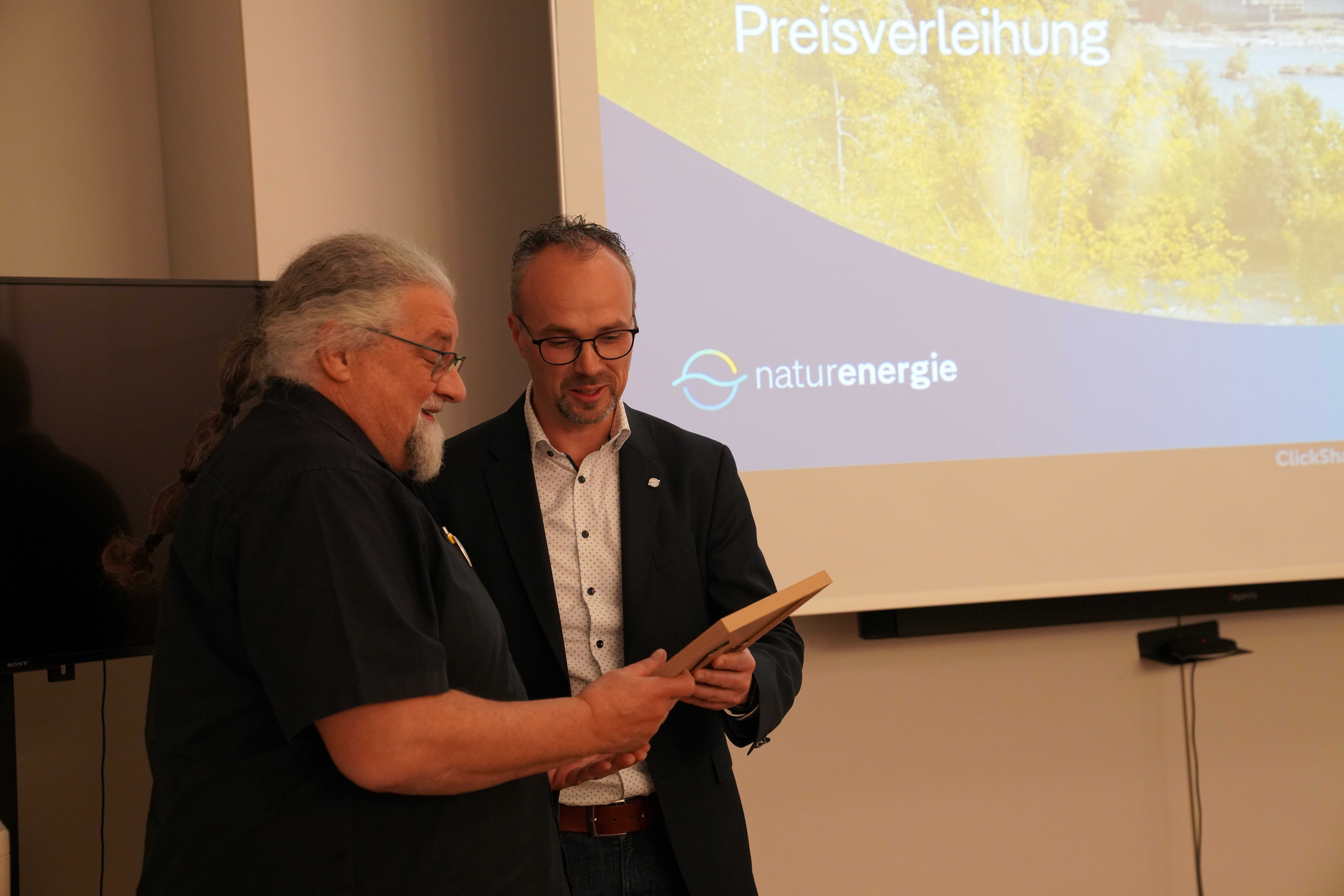 Foto 3: Hans Zeiher, Vorsitzender des Angelsportvereins Schopfheim, freut sich über die Urkunde aus den Händen von Jurymitglied Thomas Sauter. Foto: naturenergie