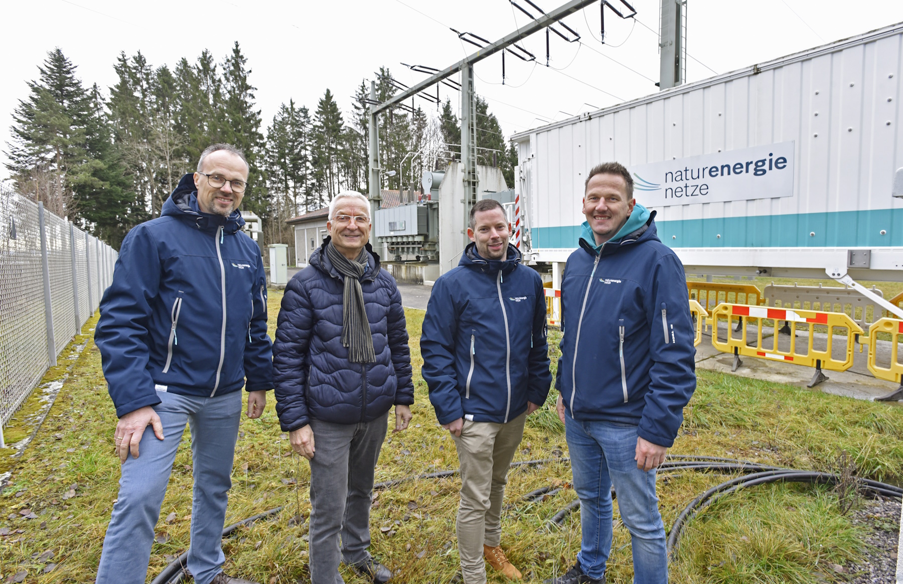 Bild:Gemeinsam für starke Netze in Bonndorf (v. l.): Thomas Sauter, Kommunalbetreuer naturenergie netze, Bürgermeister Marlon Jost, Patrick Strohmeier, Teamleitung Hochspannung, und Projektbetreuer Tobias Mutter informierten sich über die laufenden und geplanten Investitionen in den Ausbau und die Modernisierung des Stromnetzes, mit denen die Versorgungssicherheit gestärkt und Kapazitäten für die Energiezukunft der Stadt geschaffen werden. Foto: Roland Sigwart / naturenergie netze GmbH