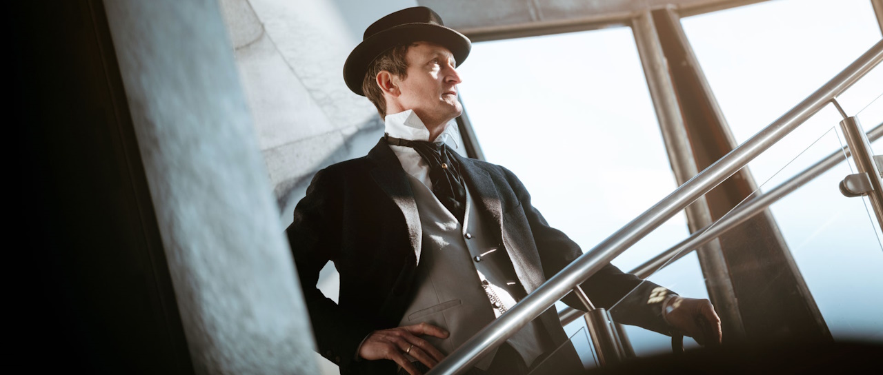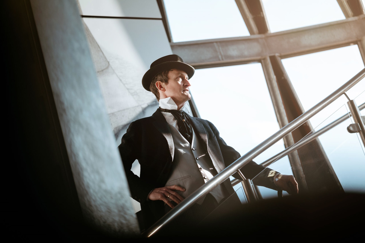 Bild: naturenergie‑Mitarbeiter Simon Kuner schlüpft für die historischen Führungen in die Rolle des Industriepioniers Emil Rathenau. Foto: naturenergie