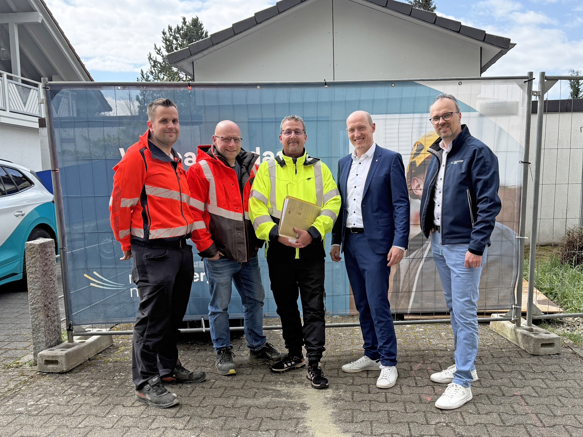 Bild: Matthias Maier und Oliver Trenkle (Hegau Energie), Alexander Niederkorn (Baukoordinator), Bürgermeister Jonathan Berggötz und Thomas Sauter (Kommunalbetreuer naturenergie netze) trafen sich vor Ort in der Kernstadt Bad Dürrheims bei den Verlegungsarbeiten für ein zukunftsfähiges Stromnetz (von links). Foto: Stadtverwaltung Bad Dürrheim
